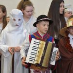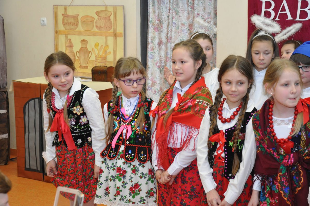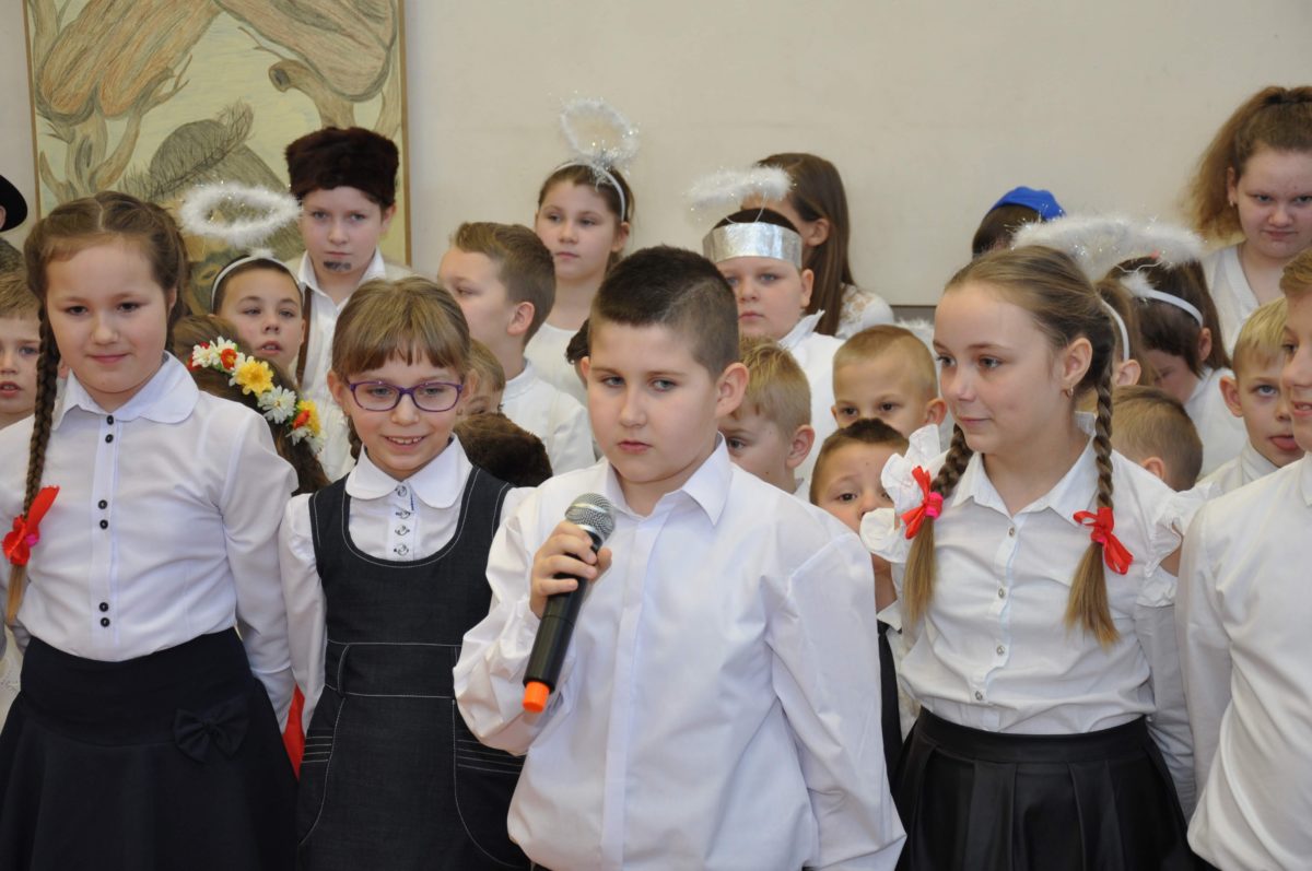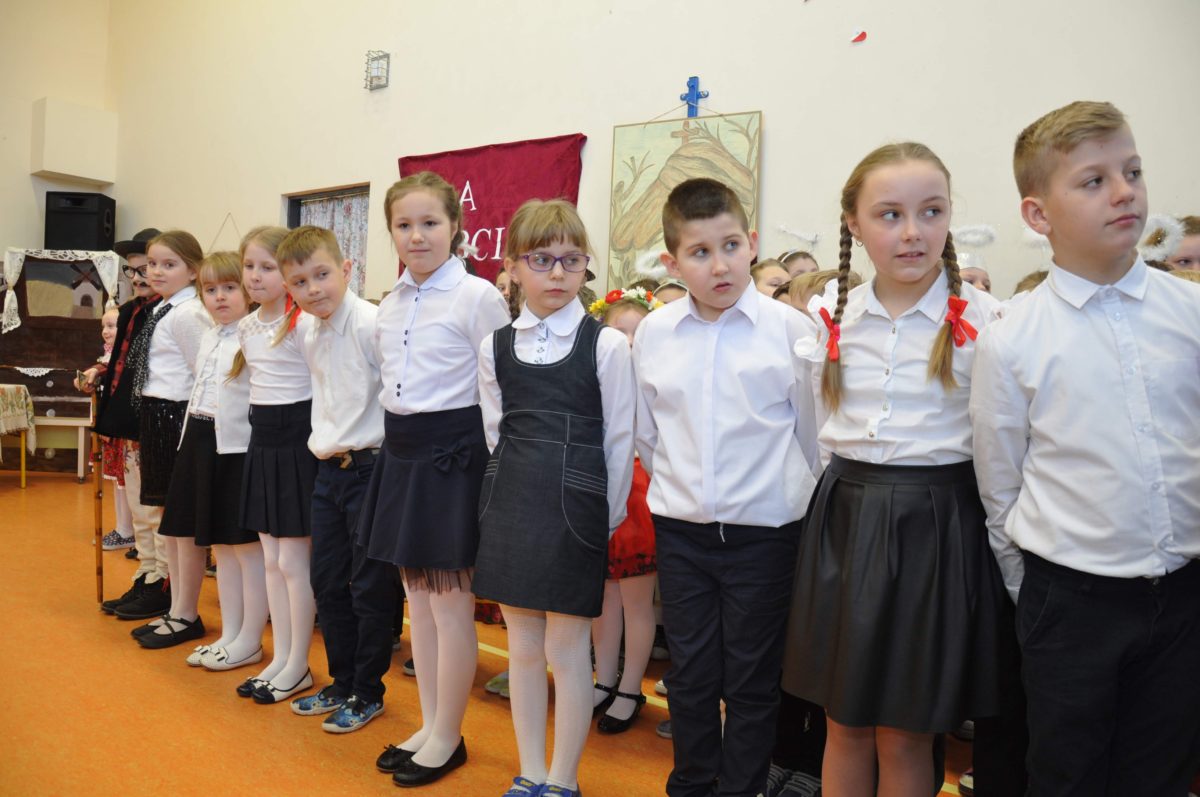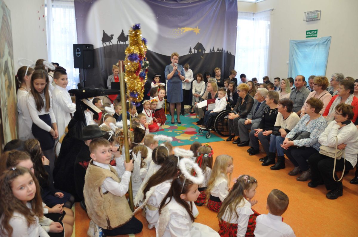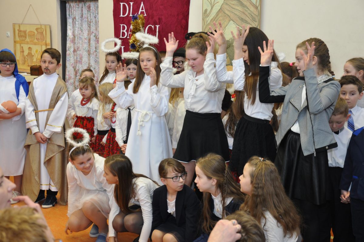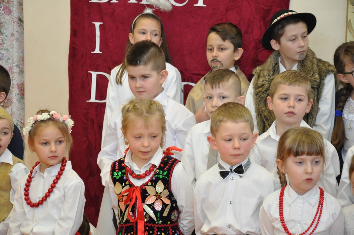 Uroczystość rozpoczęła Pani Dyrektor Grażyna, która powitała wszystkich i zaprosiła do wspólnego oglądania występów dzieci. Dzieci z klasy 3, pod przewodnictwem Pani Marty Słaby, przygotowały główną część programu. Następnie klasa 1, pod przewodnictwem Pani Jadwigi Bochniarz, klasa 2, pod przewodnictwem Pani Anety Lompart, klasa 5, pod przewodnictwem Pani Moniki Wojtaszek i oddział zerówki, pod przewodnictwem Pani Doroty Ogorzały zaśpiewały w ramach koncertu życzeń piękne kolędy i pastorałki z życzeniami dla Babć i Dziadków. Na wyróżnienie zasługuję Lena, która wykonała piękną pastorałkę oraz Oliwier, który wspaniale zagrał na akordeonie 100 lat dla zaproszonych gości. Po występach dzieci podchodziły do swoich dziadków i babć, składali im życzenia i wręczali przygotowane przez Panią Justynę Sejud upominki. Po życzeniach wszyscy oglądnęli wysęp Koła Gospodyń Wiejskich, które przygotowało występ pt. Gość Oczekiwany. Pani Dyrektor przekazał występującym upominki i podziękowało Kołu za ich trud i zaangażowanie na rzecz szkoły.
