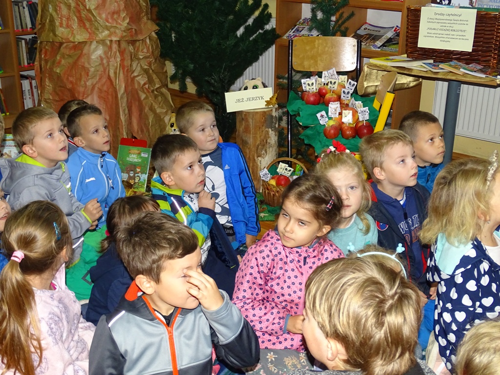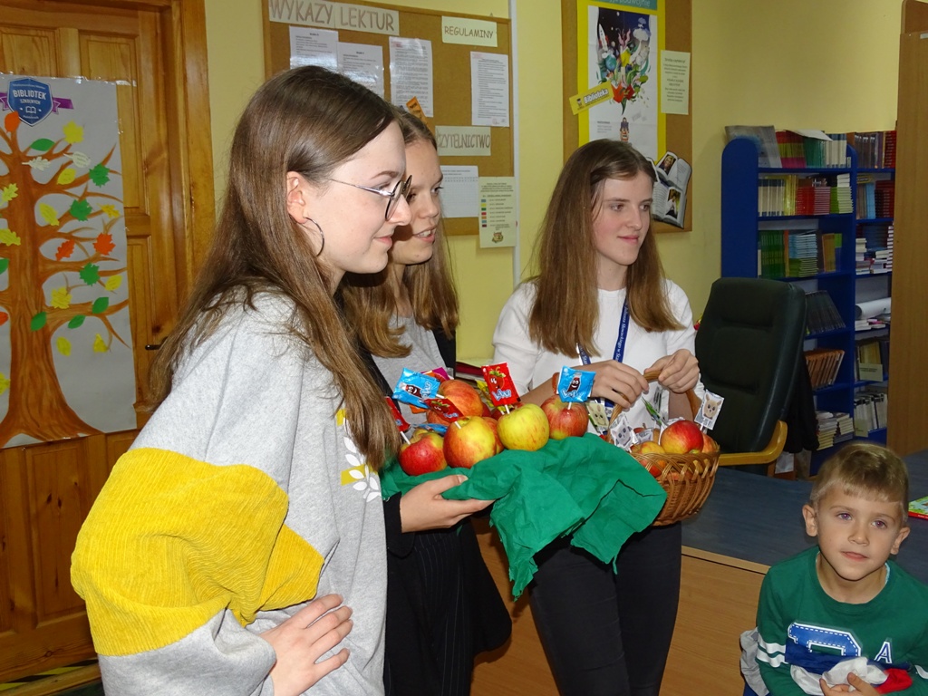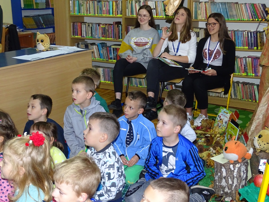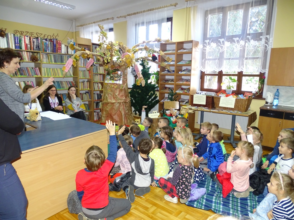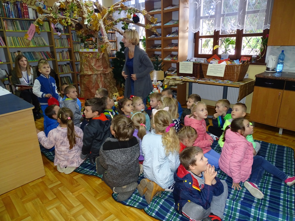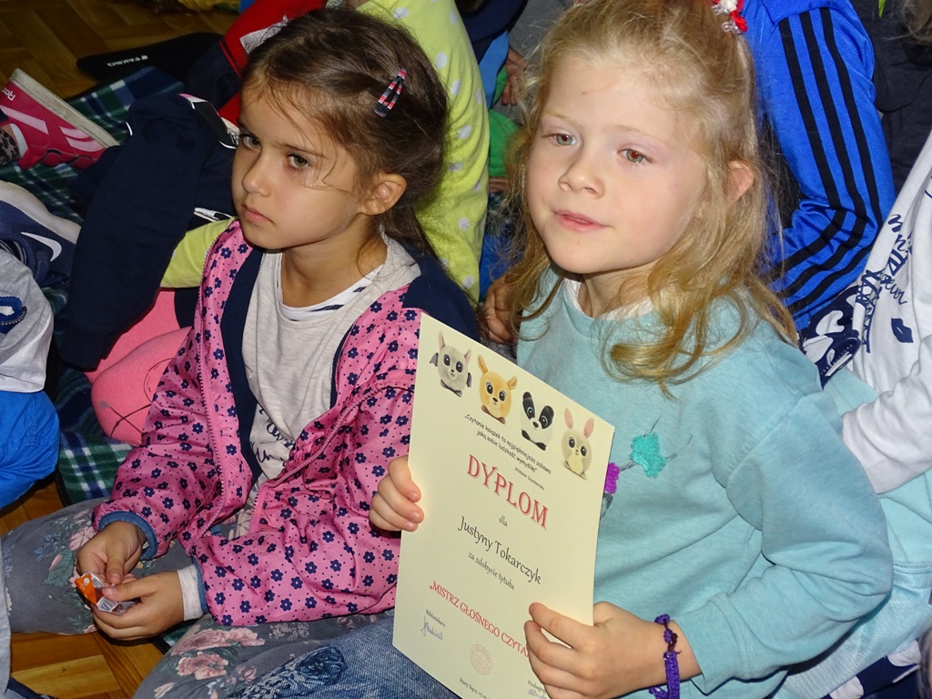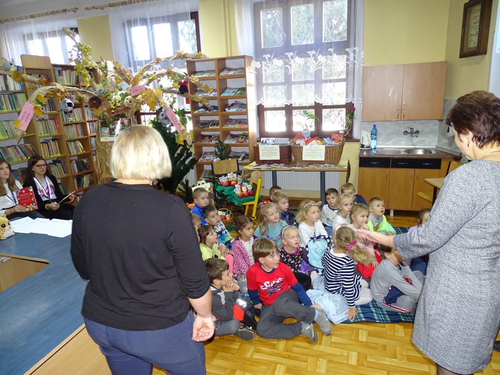 17 października 2019 roku na „słodziakową” polanę organizatorzy zaprosili najstarszą grupę przedszkolaków z Niepublicznego Przedszkola „Pszczółka Maja”. Wolontariuszki ze Szkoły Podstawowej nr 2 bardzo „utrudniły” przedszkolakom dotarcie do celu czyli do biblioteki szkolnej. Zostawiane między innymi: w parku przy fontannie, w donicy z iglakiem przy Szkole Muzycznej zadania, znaki i tajemnicze listy wskazywały drogę, a jednocześnie dostarczyły najmłodszym dodatkowych emocji. Były ważnym elementem ćwiczącym uwagę, spostrzegawczość oraz logiczne myślenie. Atrakcyjnym zakończeniem podchodów było pokonanie „słodziakowej przeszkody”, otwarcie bramy i dotarcie do miejsca, skąd dobiegały dźwięki muzyki czyli do biblioteki – na polankę pod Magiczne Drzewo. Tu czekały na przedszkolaków zagadki na temat jesieni, fragmenty książki „Gang Słodziaków – przyjaciele mogą wiele, czyli magia z leśnej polany” i najważniejsze konkurs głośnego czytania. Przedszkolaki kolejny raz udowodniły, że czytanie książek to dla nich sprawa bardzo ważna. Mimo lekkiego stresu, losowały przygotowane fragmenty książki i pięknie je odczytywały. Mistrzami Głośnego Czytania zostali: Justyna Tokarczyk i Artur Zańko. Mamy nadzieję, że wszelkie akcje, w których bohaterką jest książka, przyczynią się do budowania nawyku codziennego czytania u najmłodszych i zaowocują ich dużą aktywnością czytelniczą w przyszłości.