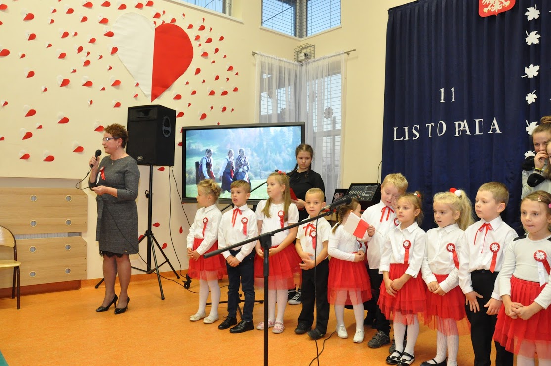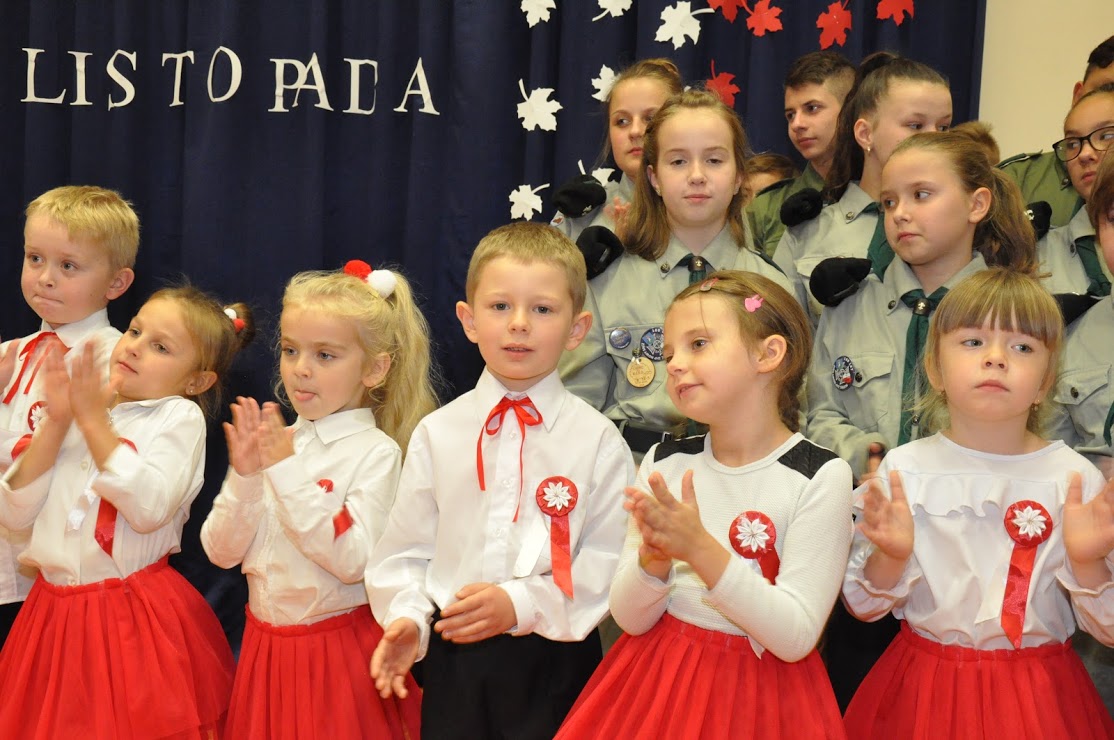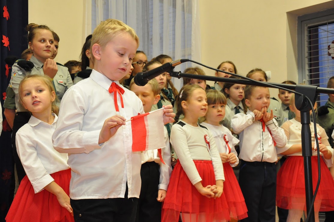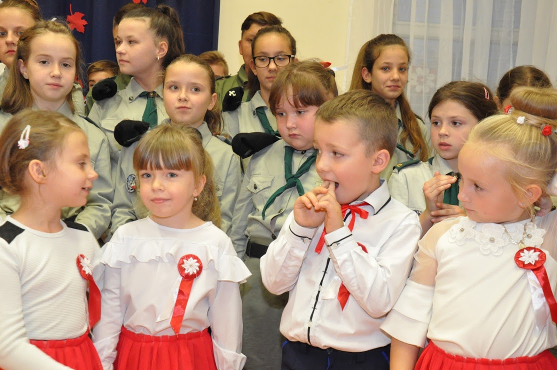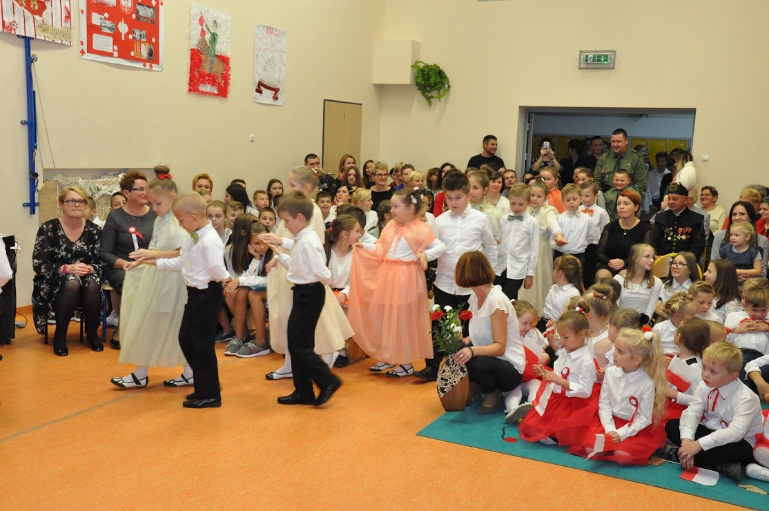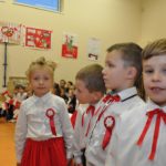 W czasie koncertu mogliśmy zobaczyć występy dzieci z zerówki, Polonez wykonany przez uczniów klasy pierwszej i trzeciej, śpiew Leny Drożdż oraz śpiew Kingi i Oliwii Stachoń, które występowały jako przedstawiciele drużyny zuchowej działającej w naszej szkole. Nie zabrakło Drużyny Harcerskiej Wilki, która zawsze w czasie takich uroczystości służy pomocą i wsparciem. Najważniejszym punktem uroczystości było odśpiewanie hymnu narodowego oraz posadzenie dębu, który za 100 lat przerośnie naszą szkołę. Pani Dyrektor w swoim przemówieniu przekazała pozdrowienia od Pana Burmistrza Jacka Lelka, który nie mógł w tym roku u nas gościć, ale pamiętamy Jego prośbę z tamtego roku, aby każdy dom przystrojony był w biało-czerwoną flagę. Z tej racji Pani Dyrektor ogłosiła, że każdy kto przyniesie zdjęcie swojego domu z wywieszoną flagą otrzyma pozytywny wpis z zachowania do e-dziennika. Pani Dyrektor rozdała też nagrody z konkursu na najładniej przystrojoną salę lekcyjną.