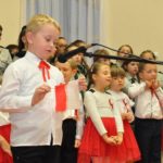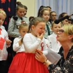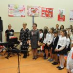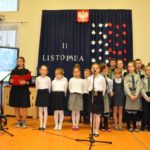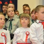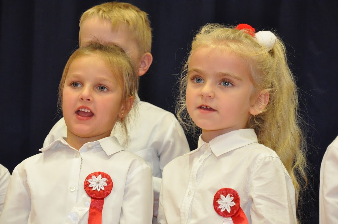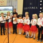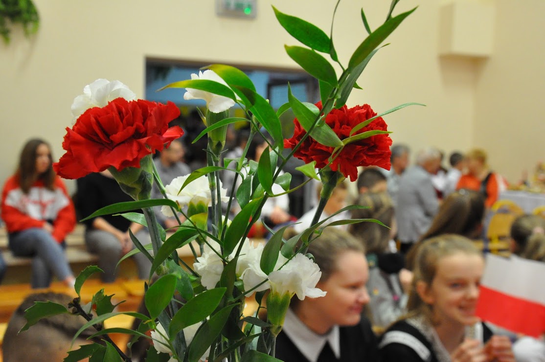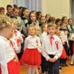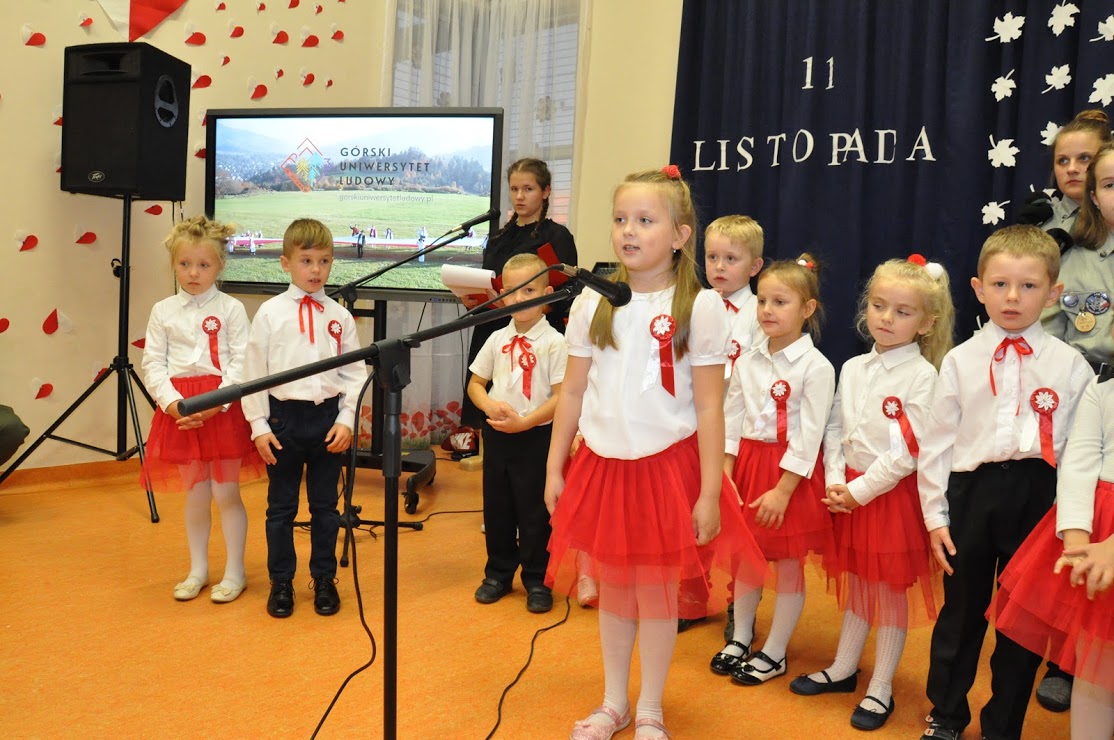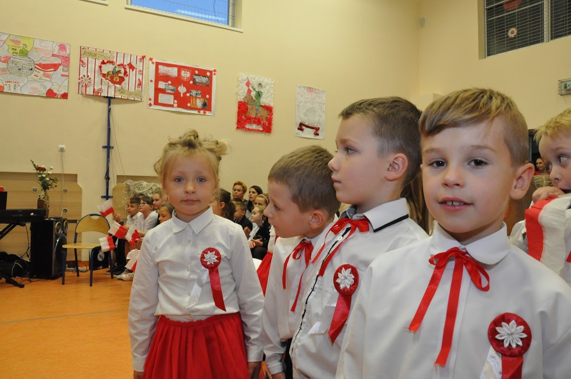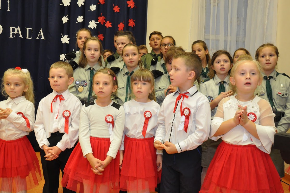 W czasie koncertu mogliśmy zobaczyć występy dzieci z zerówki, Polonez wykonany przez uczniów klasy pierwszej i trzeciej, śpiew Leny Drożdż oraz śpiew Kingi i Oliwii Stachoń, które występowały jako przedstawiciele drużyny zuchowej działającej w naszej szkole. Nie zabrakło Drużyny Harcerskiej Wilki, która zawsze w czasie takich uroczystości służy pomocą i wsparciem. Najważniejszym punktem uroczystości było odśpiewanie hymnu narodowego oraz posadzenie dębu, który za 100 lat przerośnie naszą szkołę. Pani Dyrektor w swoim przemówieniu przekazała pozdrowienia od Pana Burmistrza Jacka Lelka, który nie mógł w tym roku u nas gościć, ale pamiętamy Jego prośbę z tamtego roku, aby każdy dom przystrojony był w biało-czerwoną flagę. Z tej racji Pani Dyrektor ogłosiła, że każdy kto przyniesie zdjęcie swojego domu z wywieszoną flagą otrzyma pozytywny wpis z zachowania do e-dziennika. Pani Dyrektor rozdała też nagrody z konkursu na najładniej przystrojoną salę lekcyjną.