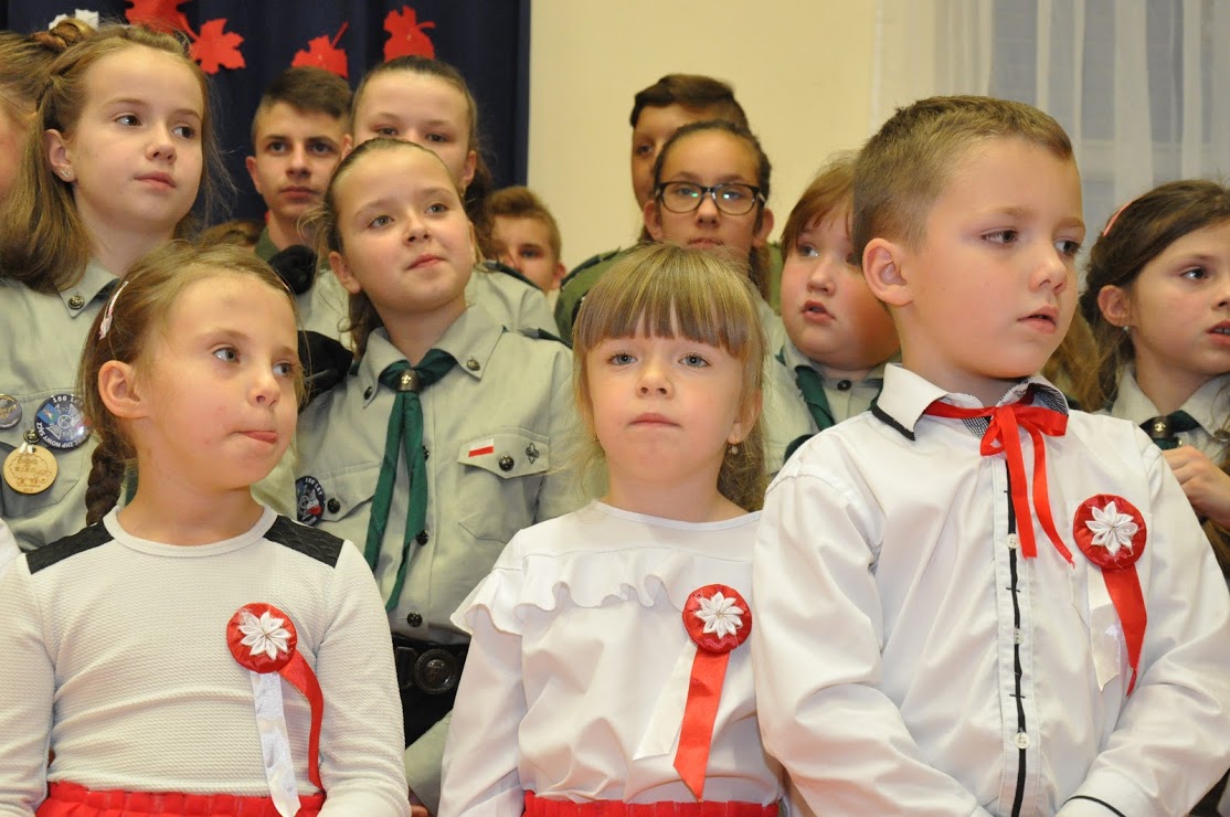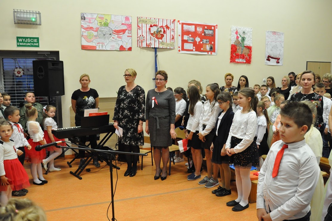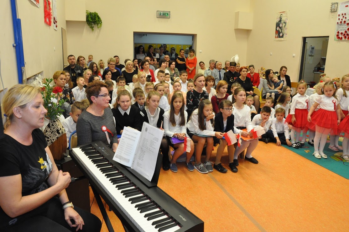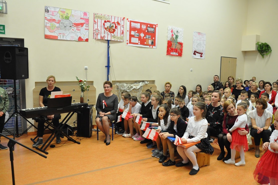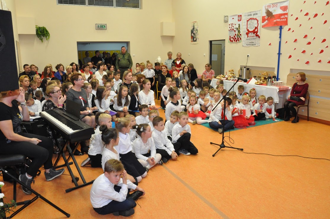 Dziękujemy wszystkim za obecność i wspólne uczczenie 100-lecia Niepodległości. Dziękujemy Pani Dorotce Ogorzały, dzieciom z zerówki i ich rodzicom za przygotowanie występu. Dziękujemy Pani Agacie Nicpońskiej, naszemu szkolnemu muzykowi, Pani Marcie Słaby i Jadwidze Bochniarz za przygotowanie występów dzieci ze swoich klas. Dziękujemy Pani Mirosławie Wąchała, Pani Justynie Sejud i Małgorzacie Drożdż za przystrojenie sali gimnastycznej oraz tym dzieciom i rodzicom, którzy wykonali plakaty patriotyczne – one także zawisły jako wystrój sali. Dziękujemy Radzie Rodziców oraz rodzicom za przygotowanie poczęstunku i nieustanne wspieranie działań wychowawczych i edukacyjnych naszej szkoły. Dziękujemy obecnym rodzicom i zaproszonym gościom, a zwłaszcza Panu Sołtysowi i przedstawicielom Stowarzyszeń. Dziękujemy Panu Kazimierzowi Górskiemu za przygotowanie drużyny Harcerskiej do występów. Dziękujemy w końcu Pani Dyrektor Grażynie Smaga za jej życzliwe i ciepłe słowa, które nas wszystkich motywują do pracy na rzecz integrowania szkoły z lokalną społecznością oraz wychowania patriotycznego dzieci i młodzieży. Czy ktoś zauważył w ogóle, że nasza Pani Dyrektor zmieniła z okazji koncertu fryzurę?