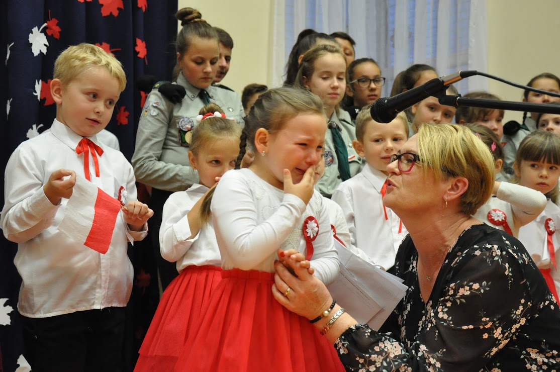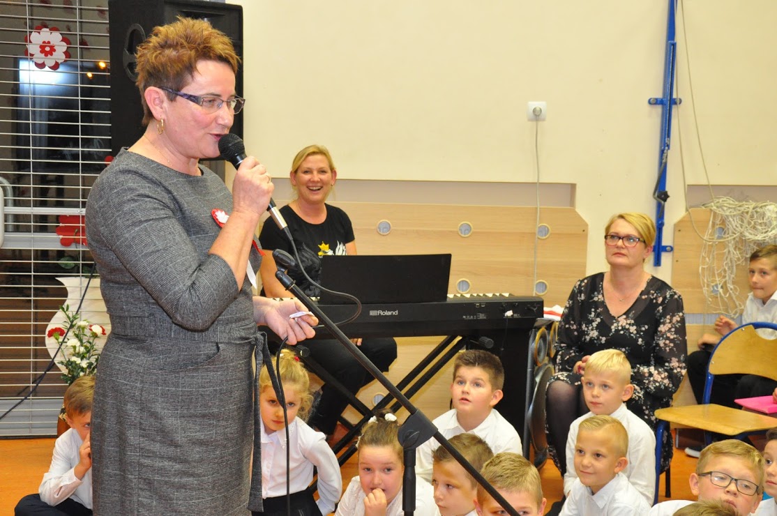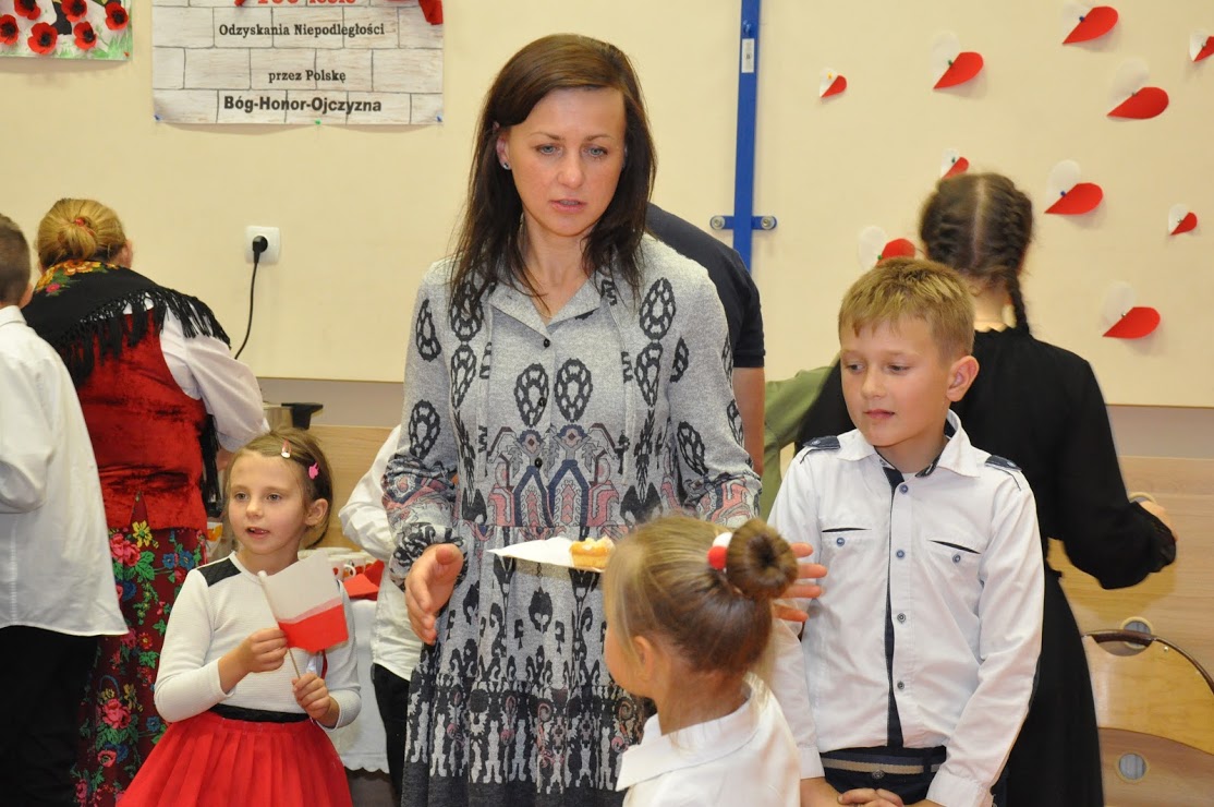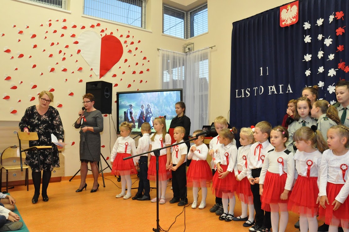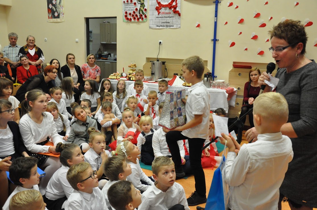Dziękujemy wszystkim za obecność i wspólne uczczenie 100-lecia Niepodległości. Dziękujemy Pani Dorotce Ogorzały, dzieciom z zerówki i ich rodzicom za przygotowanie występu. Dziękujemy Pani Agacie Nicpońskiej, naszemu szkolnemu muzykowi, Pani Marcie Słaby i Jadwidze Bochniarz za przygotowanie występów dzieci ze swoich klas. Dziękujemy Pani Mirosławie Wąchała, Pani Justynie Sejud i Małgorzacie Drożdż za przystrojenie sali gimnastycznej oraz tym dzieciom i rodzicom, którzy wykonali plakaty patriotyczne – one także zawisły jako wystrój sali. Dziękujemy Radzie Rodziców oraz rodzicom za przygotowanie poczęstunku i nieustanne wspieranie działań wychowawczych i edukacyjnych naszej szkoły. Dziękujemy obecnym rodzicom i zaproszonym gościom, a zwłaszcza Panu Sołtysowi i przedstawicielom Stowarzyszeń. Dziękujemy Panu Kazimierzowi Górskiemu za przygotowanie drużyny Harcerskiej do występów. Dziękujemy w końcu Pani Dyrektor Grażynie Smaga za jej życzliwe i ciepłe słowa, które nas wszystkich motywują do pracy na rzecz integrowania szkoły z lokalną społecznością oraz wychowania patriotycznego dzieci i młodzieży. Czy ktoś zauważył w ogóle, że nasza Pani Dyrektor zmieniła z okazji koncertu fryzurę?