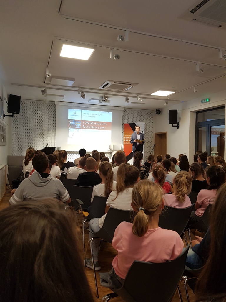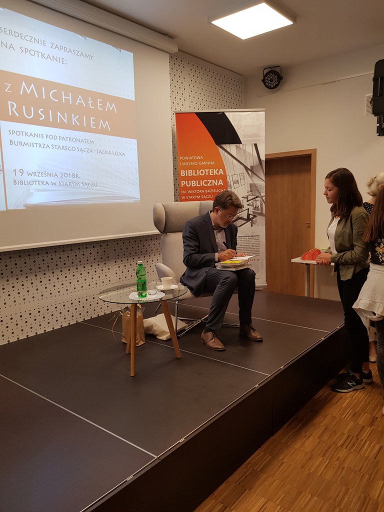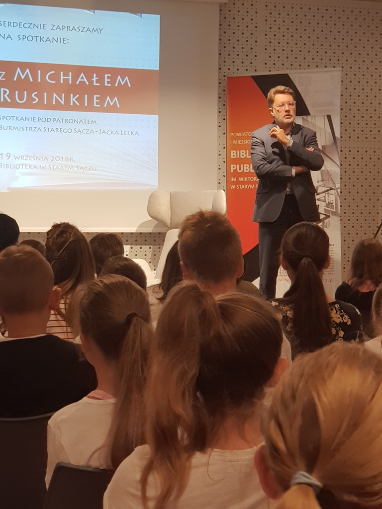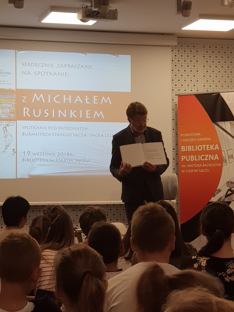 W dniu 19 września 2018 roku gościem uczniów Szkoły Podstawowej nr 1 im. ks. prof. Józefa Tischnera w Starym Sączu był autor książek dla dzieci, tłumacz z języka angielskiego (m.in. Milne’a, Barriego, Bonda, Snicketa, Donaldsona, Schulza, Ungerera i Goreya), pracownik naukowy, adiunkt w Katedrze Teorii Literatury na Wydziale Polonistyki Uniwersytetu Jagiellońskiego, sekretarz Noblistki Wisławy Szymborskiej – dr hab. Michał Rusinek. Autor książek tj. np. „Krakowski Rynek…”, „Zaklęcie na W”, „Rok 1989. Mała książka o pewnej kurtynie, czekoladzie i wolności”, „Co ty mówisz?! Magia słów, czyli retoryka dla dzieci”, „Kiedy byłem mały…”, „Jak przekręcać i przeklinać” przybliżył uczniom SP1 publikacje tworzone z myślą o młodych czytelnikach. Pisarz zapoznał również uczestników spotkania z twórczością poetycką, zapraszając dzieci do intelektualnej i humorystycznej zabawy słowem. Wizyta literaturoznawcy zaprzyjaźnionego z polską Noblistą – laureatką Orderu Orła Białego – autora tekstów piosenek, m.in. Grzegorza Turnaua, Doroty Miśkiewicz i Anny Marii Jopek stanowiła dla uczniów starosądeckiej SP1 niespotykaną możliwość dialogu z człowiekiem znającym najwybitniejszych twórców kultury – pisarzy i poetów: Sławomira Mrożka, Czesława Miłosza, Zbigniewa Herberta, Umberto Eco oraz światowej sławy reżyserów: Andrzeja Wajdę, Woody Allena.