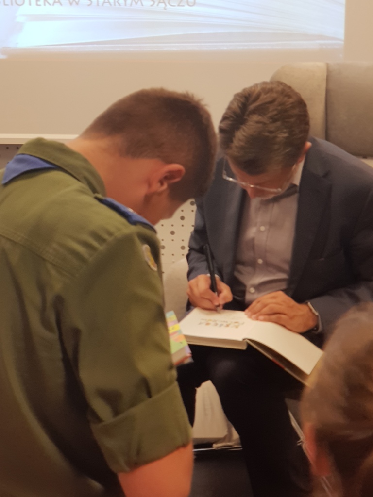 Spotkanie z pracownikiem naukowym Uniwersytetu Jagiellońskiego dr. hab. Michałem Rusinkiem swoją obecnością zaszczycili: Burmistrz Starego Sącza Pan Jacek Lelek – sprawujący honorowy patronat nad projektem edukacyjnym, Pani Ewa Zielińska – przewodnicząca starosądeckiej Rady Miejskiej, Dyrekcja Powiatowej i Miejsko-Gminnej Biblioteki Publicznej im. Wiktora Bazielicha w Starym Sączu oraz Dyrekcja Szkoły Podstawowej nr 1 im. ks. prof. Józefa Tischnera w Starym Sączu.
