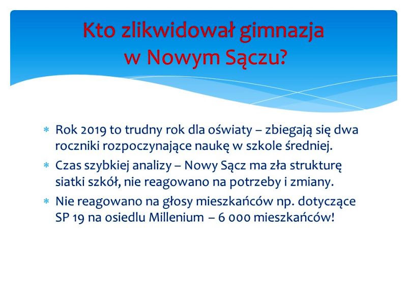 – Rok 2019 będzie bardzo trudny dla sądeckiej oświaty, ponieważ zbiegają się dwa roczniki, które kończą VIII klasę szkoły podstawowej i III klasę gimnazjum i rozpoczynają naukę w szkole średniej. Przed urzędnikami duże wyzwanie, aby zorganizować pracę w szkołach. Czas grudnia i stycznia był czasem szybkiej analizy, która doprowadziła do przedstawienia sytuacji sieci szkół w Nowym Sączu, a ta nie jest właściwa. Wielokrotnie nie reagowano na potrzeby, nie dokonywano wyprzedzająco zmian lub nie były one trafione. Nie reagowano na uwagi zgłaszane przez nauczycieli i rodziców. Takim przykładem jest likwidacja Szkoły Podstawowej nr 19 na osiedlu Millenium, gdzie mieszka, w niedalekiej odległości, blisko 6 tys. osób –podkreślił Prezydent Miasta Nowego Sącza Ludomir Handzel.