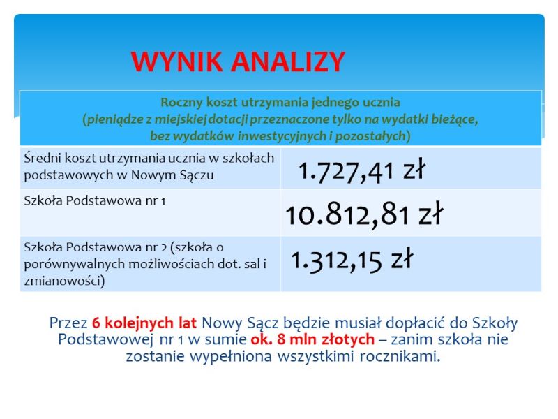 Omawiając raport przedstawił m.in. kwoty, jakie miasto dokłada do edukacji każdego dziecka. – Średnio w Nowym Sączu do edukacji jednego dziecka dokładamy kwotę 1727 zł, w SP nr 2 – 1312 zł. Natomiast w SP nr 1 jest to kwota 10 tys. 812 zł. (…) Jeżeli mamy informację, że w ciągu najbliższych 6 lat będziemy musieli do tej szkoły dopłacić 8 mln zł, to pojawia się pytanie, czy nie lepiej przeznaczyć te środki na inne cele związane z oświatą.
