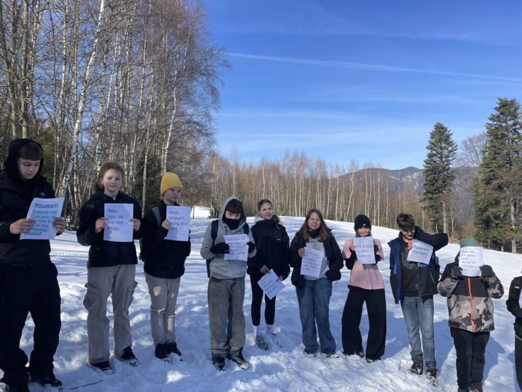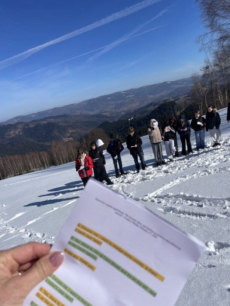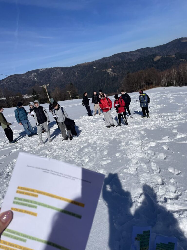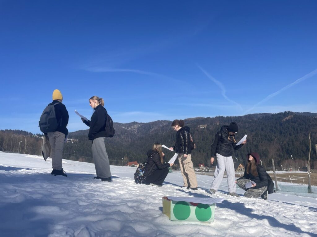 Na górskiej polanie w promieniach porannego słońca rozpoczęły się pierwsze warsztaty językowe. Pojawiła się skrzynia skarbów, a w niej odpowiedź na pytanie jakie funkcje językowe uczniowie będą trenować w nieszablonowej odsłonie. Wszystko stało się jasne, gdy koordynatorzy rozdali uczniom ich „skrzynie skarbów” , czyli zestawy wyrażeń w języku angielskim wraz z przykładami ich użycia, które można wykorzystać do pytania o drogę i wskazywania drogi. Uczniowie stojąc w półkolu kolejno odczytywali wyrażenia, a następnie w parach sprawdzali znajomość poznanych zwrotów. Tworzyli również nietypowe mapy na śniegu i odszukiwali trasę na „śnieżnej” mapie zgodnie z instrukcją. A potem ruszyli dalej w towarzystwie słońca i błękitnego nieba.