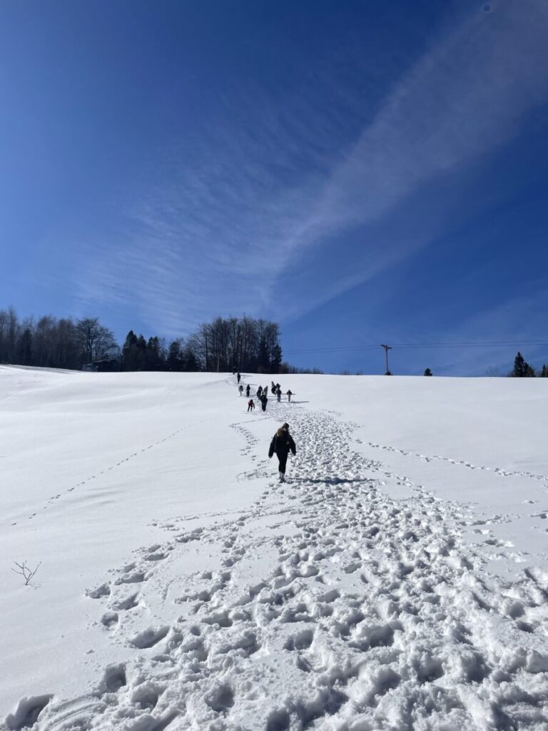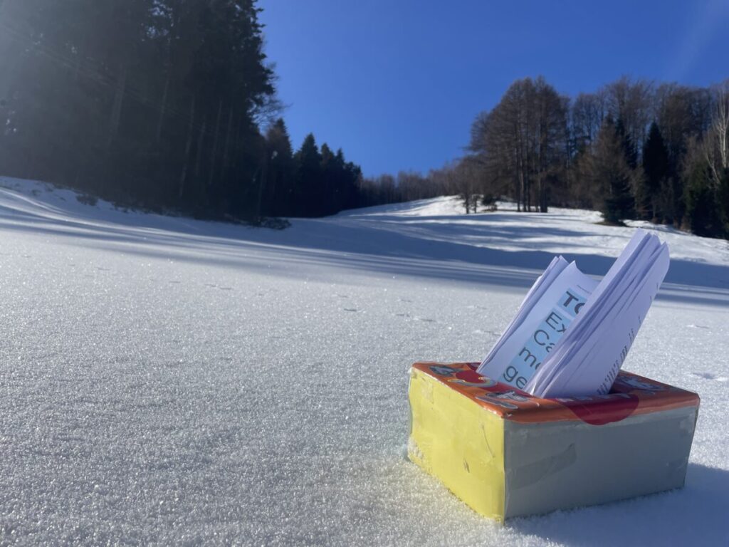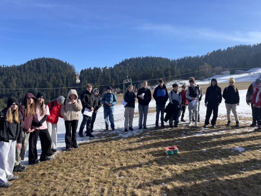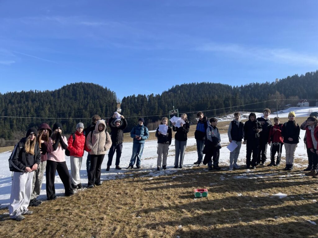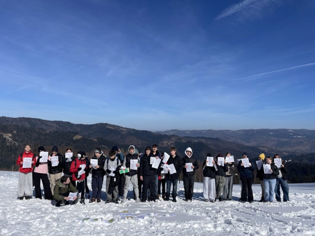 Na górskiej polanie w promieniach porannego słońca rozpoczęły się pierwsze warsztaty językowe. Pojawiła się skrzynia skarbów, a w niej odpowiedź na pytanie jakie funkcje językowe uczniowie będą trenować w nieszablonowej odsłonie. Wszystko stało się jasne, gdy koordynatorzy rozdali uczniom ich „skrzynie skarbów” , czyli zestawy wyrażeń w języku angielskim wraz z przykładami ich użycia, które można wykorzystać do pytania o drogę i wskazywania drogi. Uczniowie stojąc w półkolu kolejno odczytywali wyrażenia, a następnie w parach sprawdzali znajomość poznanych zwrotów. Tworzyli również nietypowe mapy na śniegu i odszukiwali trasę na „śnieżnej” mapie zgodnie z instrukcją. A potem ruszyli dalej w towarzystwie słońca i błękitnego nieba.
