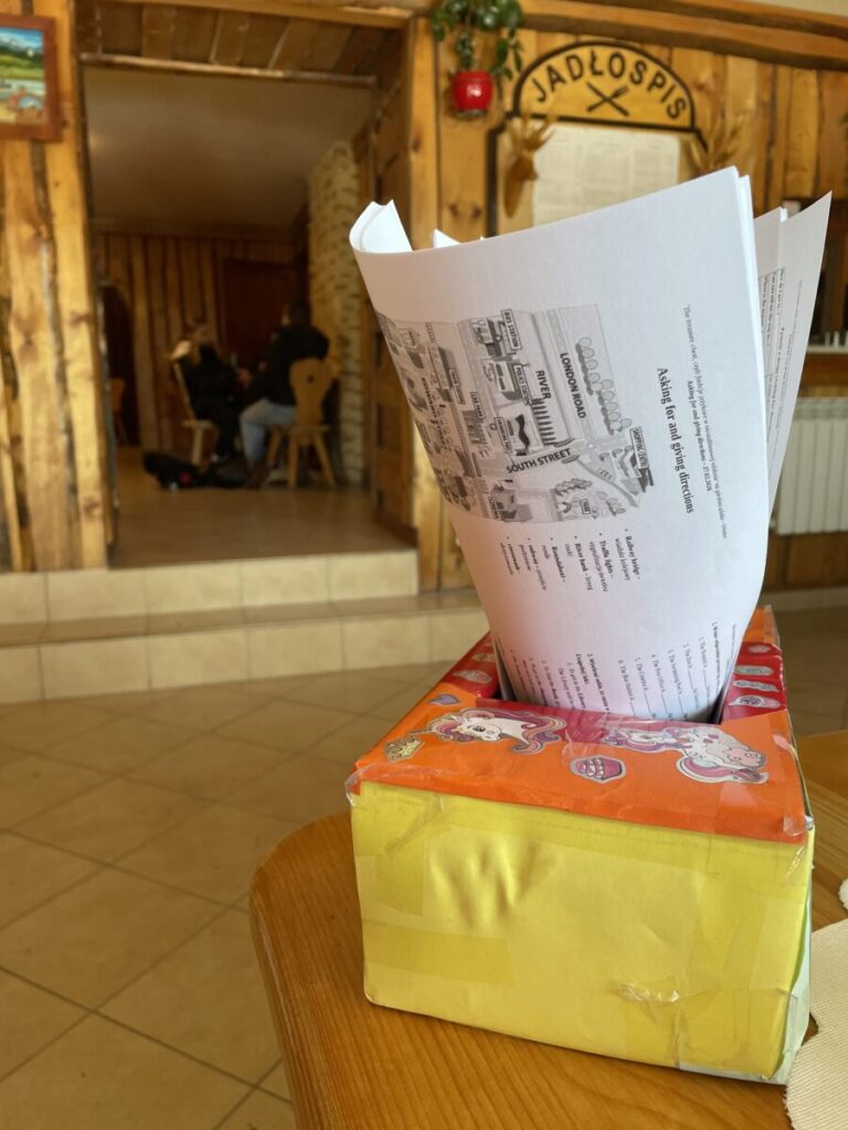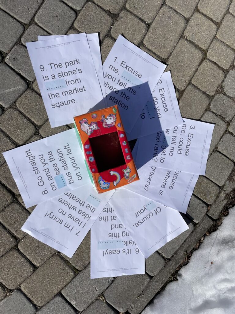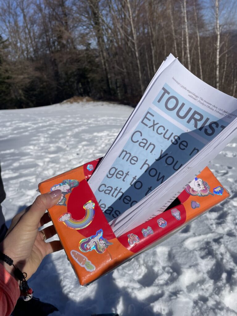 Po przerwie na odpoczynek koordynatorzy innowacji Agnieszka Obrzud i Beata Damasiewicz tworzą gigantyczne litery A i B na śniegu, a Maciej Rejowski dzieli uczniów na dwie grupy. Uczniowie trenują znajomość przyimków miejsca w języku angielskim, umiejętność mówienia o tym, co chcą zrobić w mieście, opisywania na podstawie mapy, gdzie znajdują się różne miejsca w mieście. A potem nadchodzi pora na zadanie oparte na luce informacyjnej. Uczniowie z grupy A odgrywają turystów i pytają uczniów z grupy B o różne miejsca w mieście, którzy wcielając się w rolę pracowników Biura Informacji Turystycznej wskazują im drogę wykorzystując otrzymane mapy oraz korzystając ze zwrotów, które rozłożone są na śniegu. Turyści odnajdują szukane miejsca na swoich mapach, a potem uczniowie zamieniają się rolami. Wspólnie trenują też umiejętność poprawnej intonacji i wymowy w języku angielskim odgrywając dialogi, których fragmenty pokazywane są kolejno na kartach przez koordynatorów innowacji. Po zakończeniu tej części warsztatów z języka angielskiego uczestnicy wyprawy podążają dalej, bo Przełęcz Obidza już coraz bliżej.