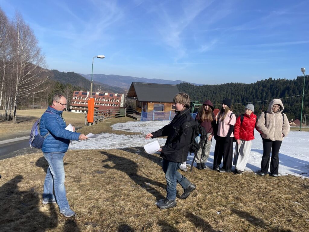 Jest cudownie, efektywnie i inspirująco, a uczniowie mówiąc w języku angielskim trenują w mniej tradycyjny sposób umiejętności przydatne podczas egzaminu ósmoklasisty. Docierają z Kosarzysk przez Górne Stacje i Przełęcz Obidza do Bacówki na Obidzy, a tam czeka na nich zasłużony odpoczynek, a potem przedostatnie zadanie językowe: uzupełnianie zdań w języku angielskim na podstawie mapy, odpowiedzi na pytania typu prawda/fałsz, samodzielne układanie dialogów z elementami pytania o drogę i wskazywania drogi. Jest tylko jedna rzecz, o której uczniowie nie wiedzą, że zadanie to jest częścią konkursową, której rozstrzygnięcie odbędzie się końcem marca podczas akademii związanej ze szkolnym finałem Dnia Bezpiecznego Internetu. Dzisiejsza piesza wycieczka miała na celu trenowanie umiejętności językowych, ale była przecież świetną okazją do tego, by zobaczyć piękno rzeczywistości poza komputerem i Internetem, w której liczą się prawdziwe relacje, wzajemne wsparcie w trudnych chwilach, empatia, zrozumienie i pomocna dłoń. Po zebraniu odpowiedzi uczniów do zadań konkursowych przy Bacówce na Obidzy została już tylko ostatnia część wyprawy- zejście przez Suchą Dolinę do Kosarzysk, powrót autobusem do Starego Sącza i dodatkowa okazja na zdobycie bonusowych punktów w konkursie.