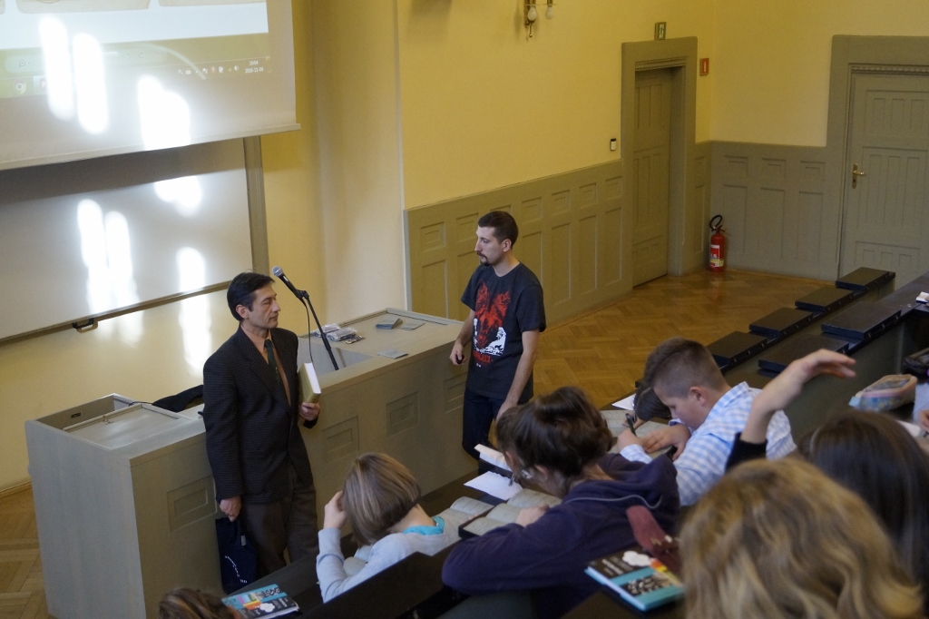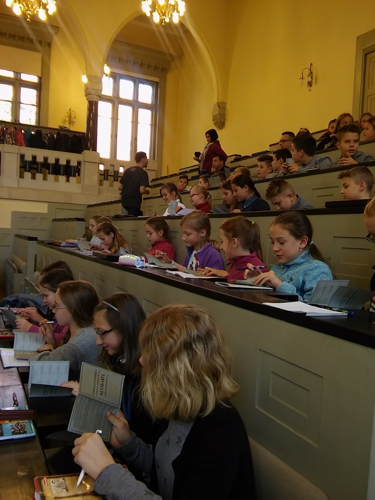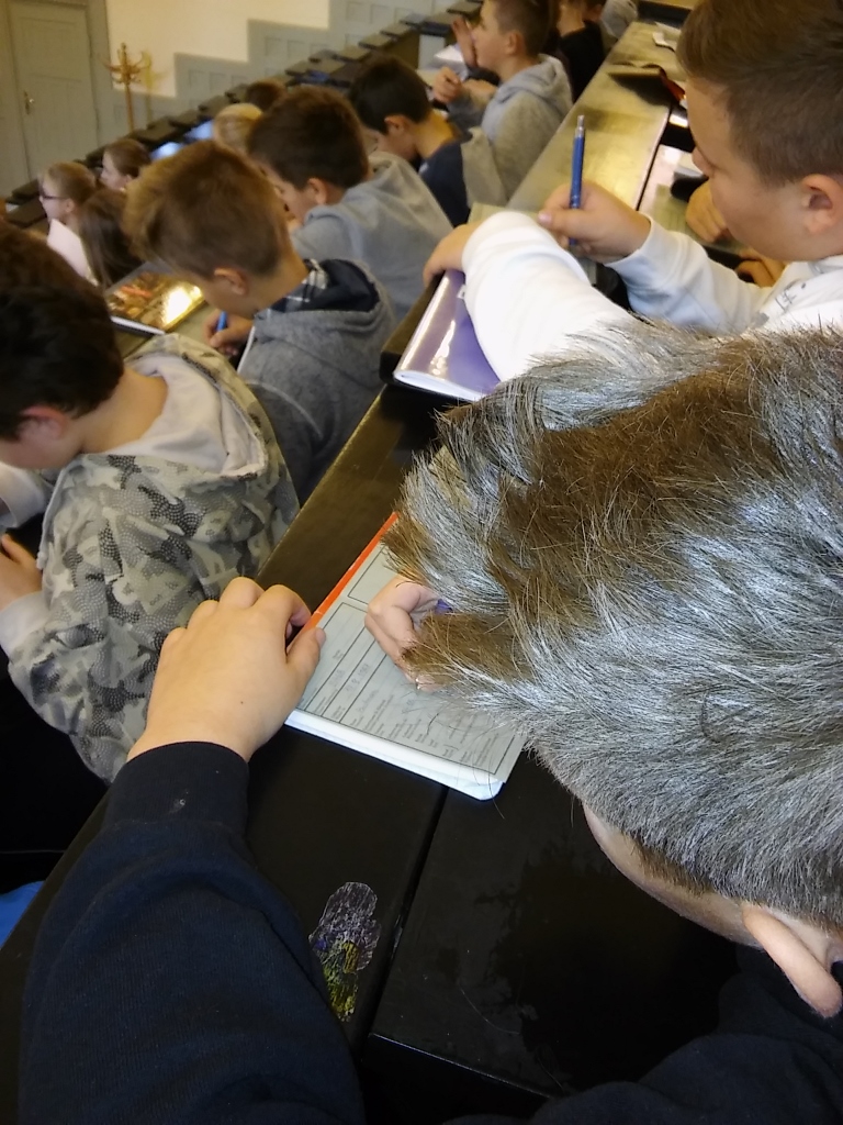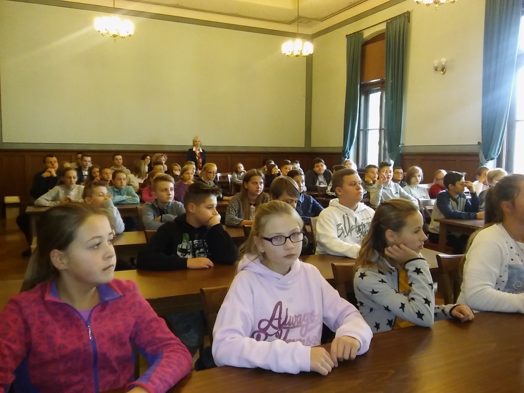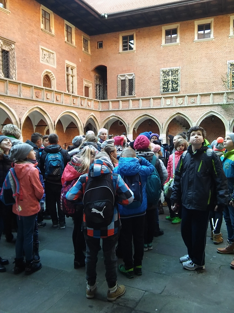 W sercu Starego Miasta, blisko historii i tradycji, grupa 54 szóstoklasistów pojawiła się punktualnie o godz. 9.00. Tu, w gmachu Collegium Witkowskiego, cieszącym się zasłużoną opinią niezwykłego miejsca filozofowania, gdzie profesor Józef Tischner przez wiele lat prowadził pasjonujące, intelektualne spotkania ze studentami, przyciągające tłumy słuchaczy, uczniowie „1” uczestniczyli w specjalnie dla nich przygotowanym wykładzie „Żołnierze Niezłomni”. Temat wykładu, zaproponowany przez organizatorki szkolnej wycieczki, stanowił kontynuację projektu „Być Polakiem w każdym wieku”, organizowanego pod honorowym patronatem Burmistrza Starego Sącza. Wykład, połączony z warsztatami, w pięknej, amfiteatralnej auli im. ks. prof. Józefa Tischnera, poprowadził doktorant UJ pan Mateusz Gawlik.