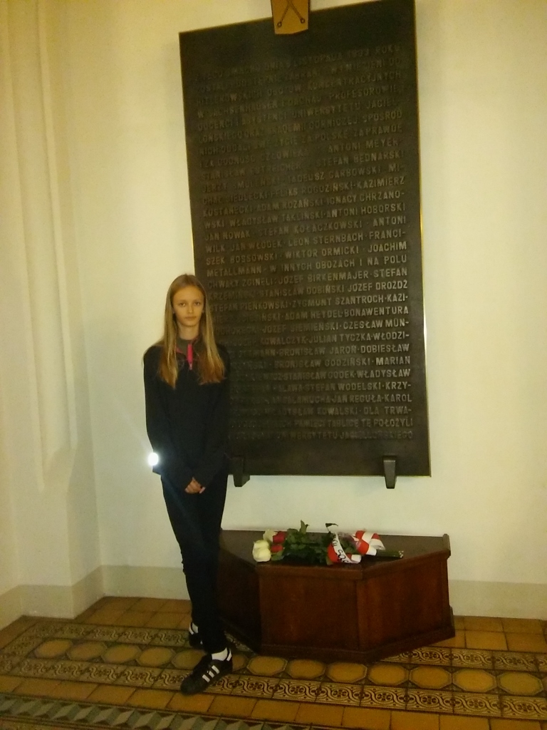 Zaszczytem dla szóstoklasistów była wizyta w historycznej sali nr 56, w której w dniu 6 listopada 1939 roku aresztowano 183 profesorów w ramach akcji Sonderaktion Krakau. W związku z 77 rocznicą tragedii profesorów uwięzionych w obozie w Sachsenhausen przewodniczący szkoły Antoni Lelek oraz Maja Kruczek reprezentująca Samorząd Uczniowski złożyli symboliczną wiązankę kwiatów przy tablicy honorującej ofiary niemieckiej akcji. Sfotografowano się także przy usytuowanym w pobliżu Collegium Novum „Dębie Wolności” zasadzonym w dniu 3 maja 1919 roku na pamiątkę odzyskania przez Polskę 11 listopada 1918 roku niepodległości.