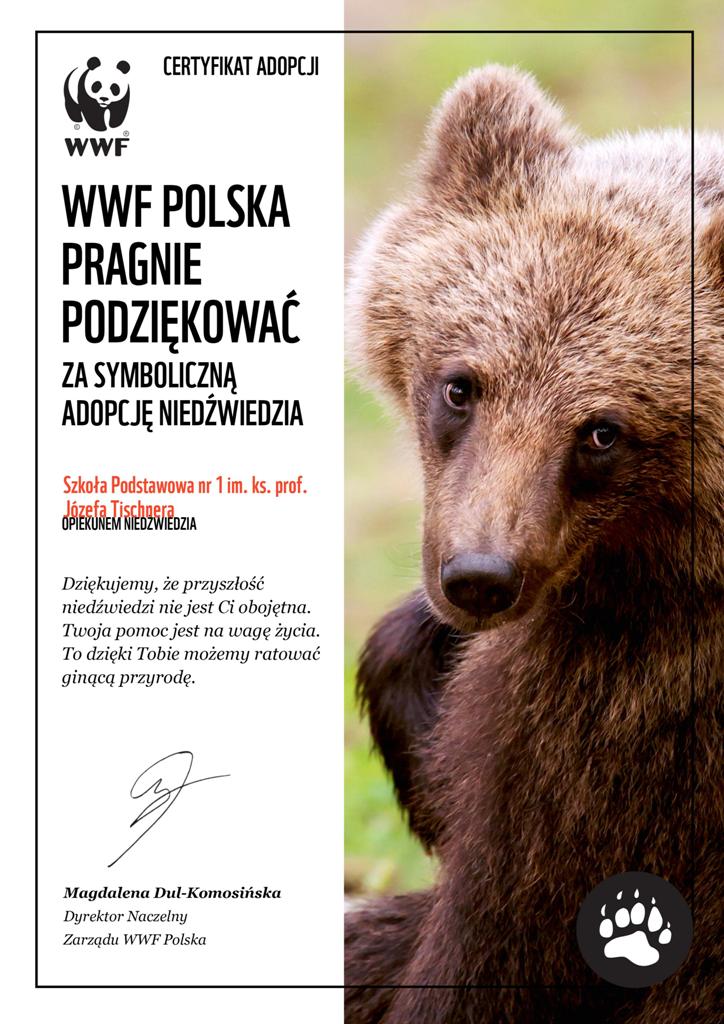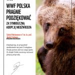 – Nawiązanie współpracy z pozarządową organizacją ekologiczną o charakterze międzynarodowym – WWF i dokonanie symbolicznej adopcji zagrożonych zwierząt: wilka i niedźwiedzia.