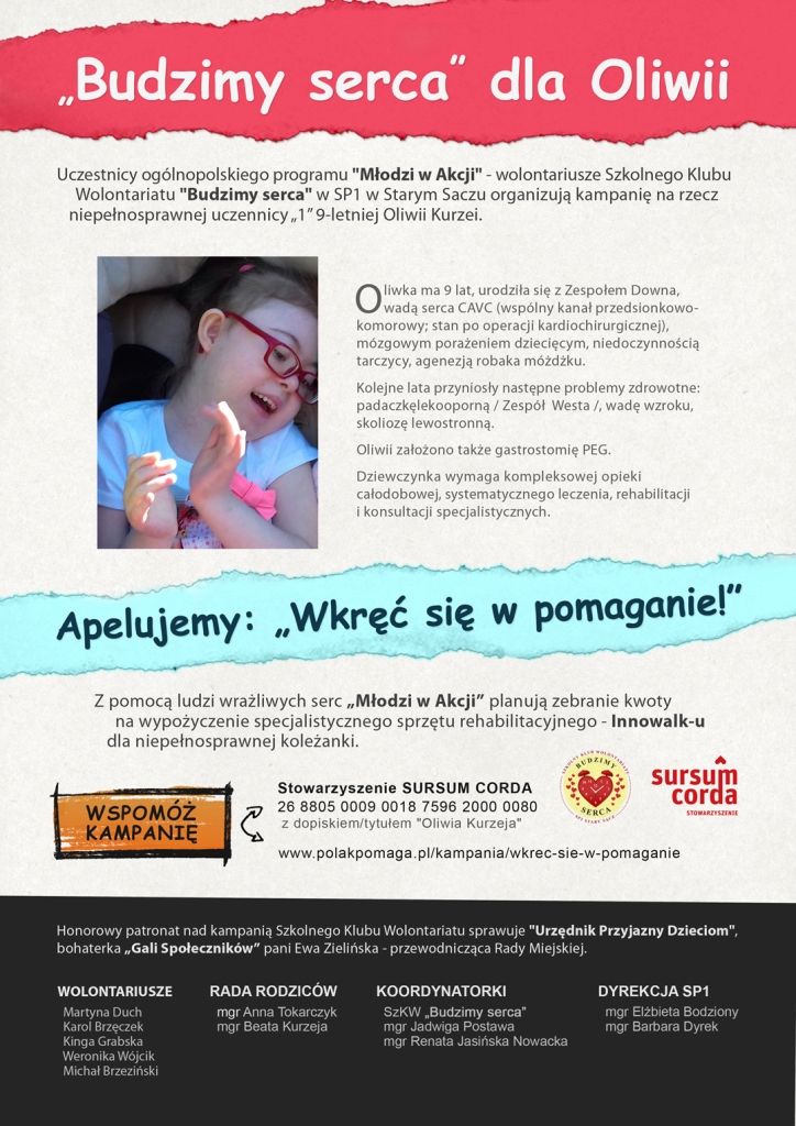 Szkolny Klub Wolontariatu „Budzimy serca” powołany w starosądeckiej SP1 zainaugurował działalność w maju 2017 roku podczas TISCHNERIADY – święta społeczności szkolnej. Od roku, współpracując z Radą Rodziców, uczy się aktywności w trosce o najbardziej potrzebujących.