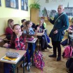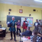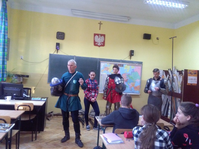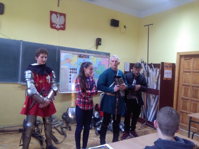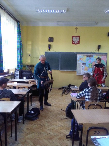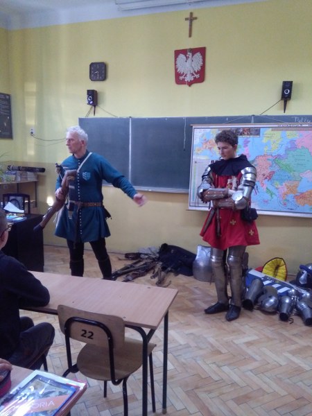Tematem lekcji były „barwne czasy wieków średnich”, a szczególnie wojny z Zakonem Krzyżackim oraz zwyczaje, uzbrojenie i sposób walki rycerstwa europejskiego. Uczniowie mieli okazję w nieszablonowy sposób poznać obyczaje naszych przodków. Dowiedzieliśmy się, jak wyglądał, jak był uzbrojony i jak walczył rycerz: około grunwaldzki Władysława Jagiełły /XV wiek/ i okresu królowej Jadwigi Andegaweńskiej i późnych krucjat /XIV wiek/.