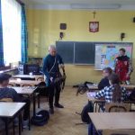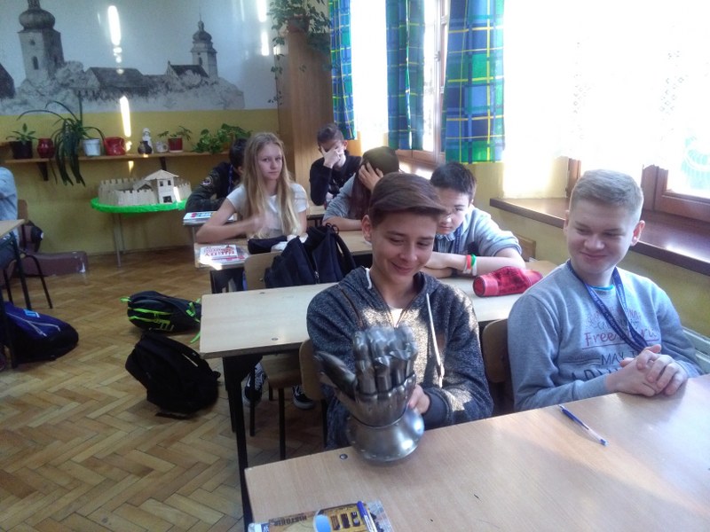 Młodzież mogła nie tylko wysłuchać prelekcji, obejrzeć i wziąć do ręki elementy uzbrojenia średniowiecznego rycerza, ale także jeden z uczniów – Jarek – został ubrany w komplety strój „woja” Władysława Jagiełły.