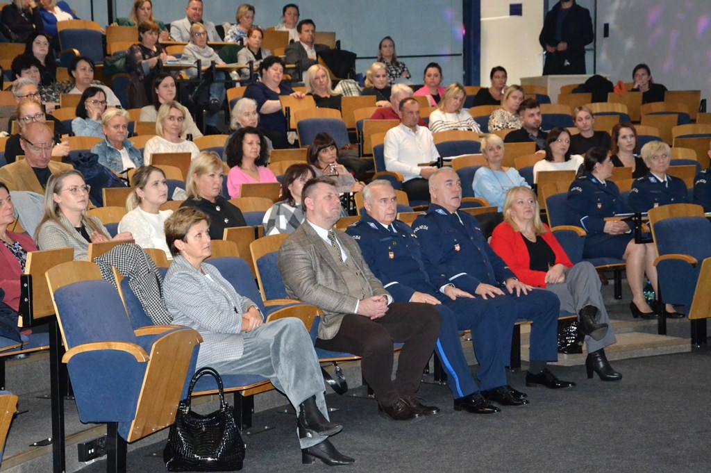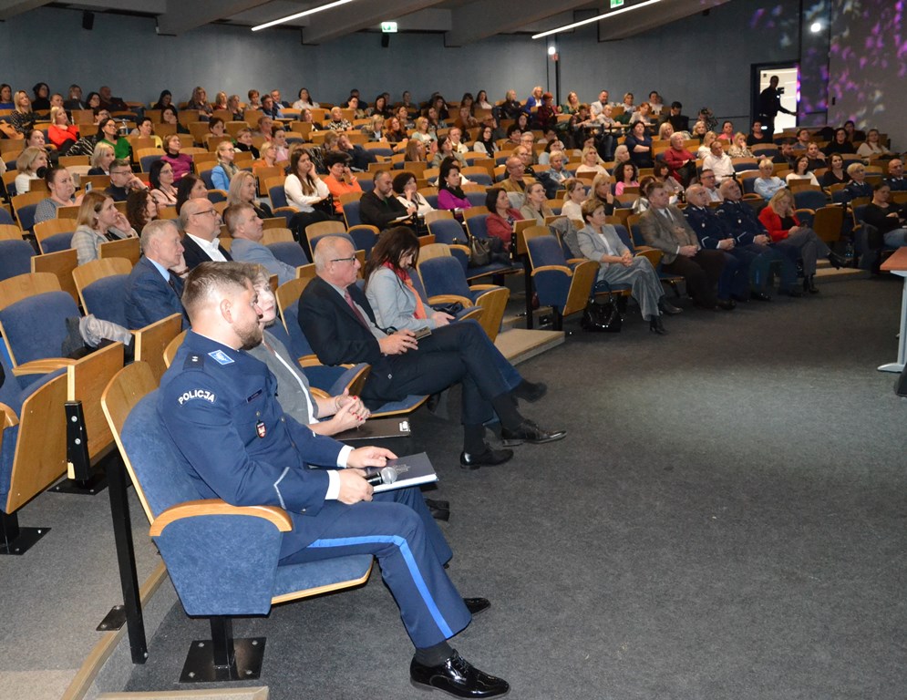 „Zagrożenia współczesnej młodzieży. Obowiązki dyrektora i nauczycieli w zapobieganiu przestępczości i demoralizacji wśród uczniów” – pod takim hasłem odbyła się dzisiaj, tj. 15 listopada br. w Nowym Sączu konferencja szkoleniowa, którą zorganizowano w auli Wyższej Szkoły Biznesu-NLU. Wśród prelegentów byli m.in. funkcjonariusze sądeckiej Policji. W wydarzeniu wzięło udział ponad 200 osób – zaproszonych gości, dyrektorów, pedagogów oraz psychologów ze szkół podstawowych i ponadpodstawowych z terenu Nowego Sącza i powiatu nowosądeckiego.