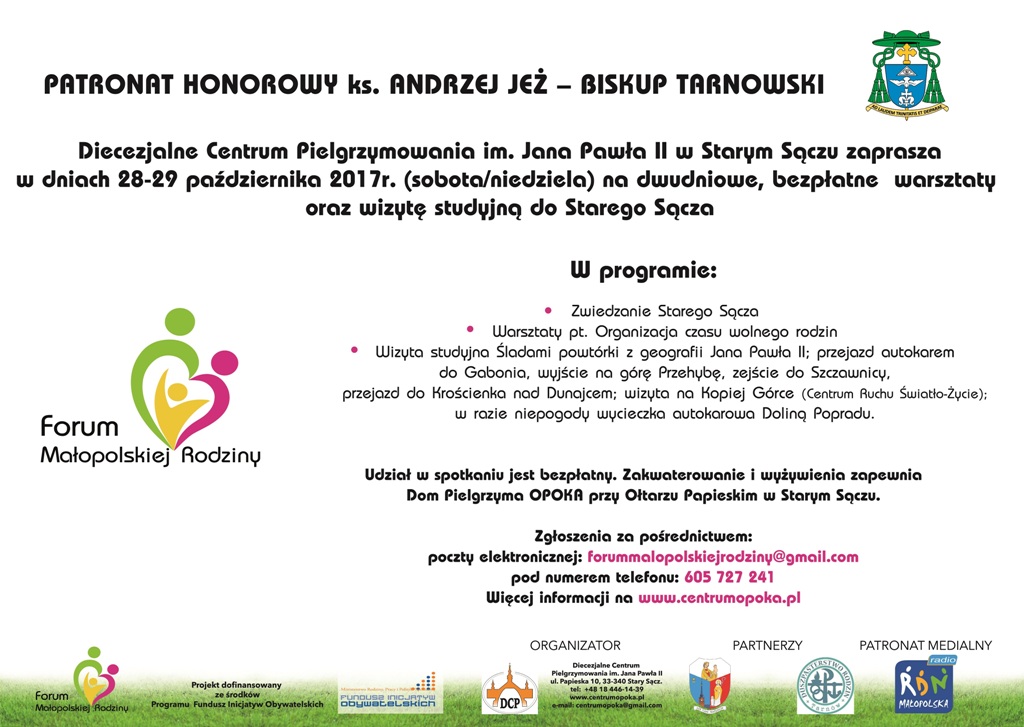 Diecezjalne Centrum Pielgrzymowania im. Jana Pawła II w Starym Sączu w ramach projektu FORUM MAŁOPOLSKIEJ RODZINY serdecznie zaprasza na warsztaty pn. ORGANIZACJA CZASU WOLNEGO RODZIN oraz wizytą studyjną ŚLADAMI POWTÓRKI Z GEOGRAFII JANA PAWŁA II, które odbędą się w dniach 28 -29 października 2017r. w Domu Pielgrzyma OPOKA przy Ołtarzu Papieskim w Starym Sączu.