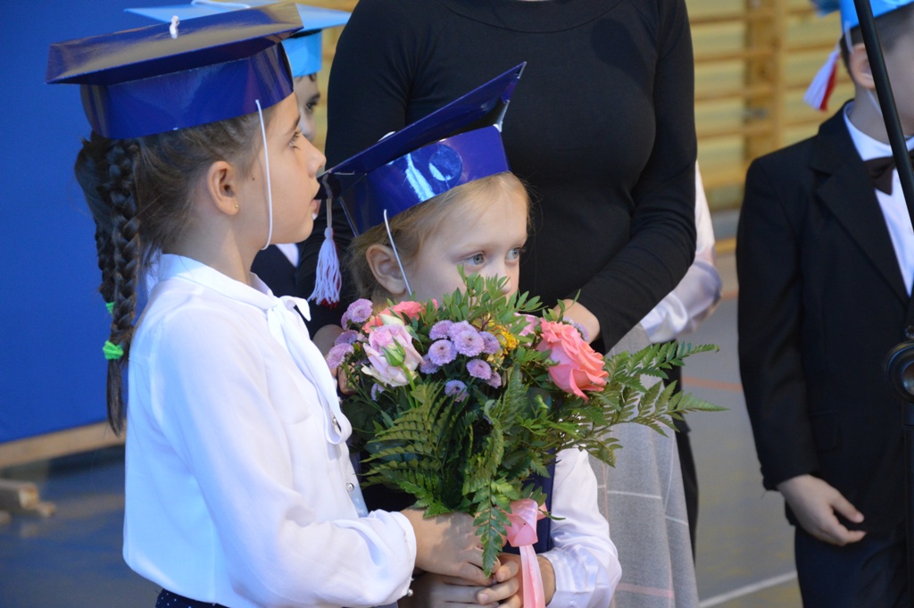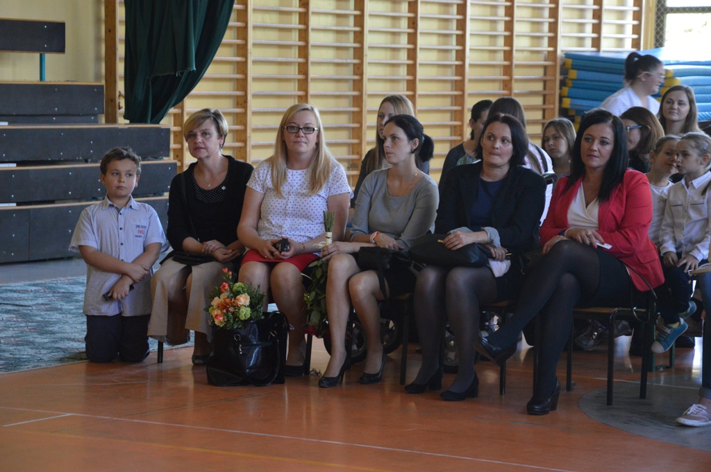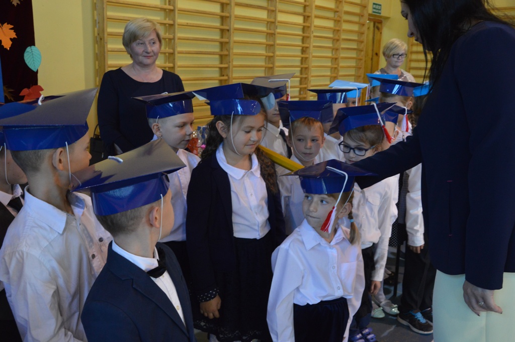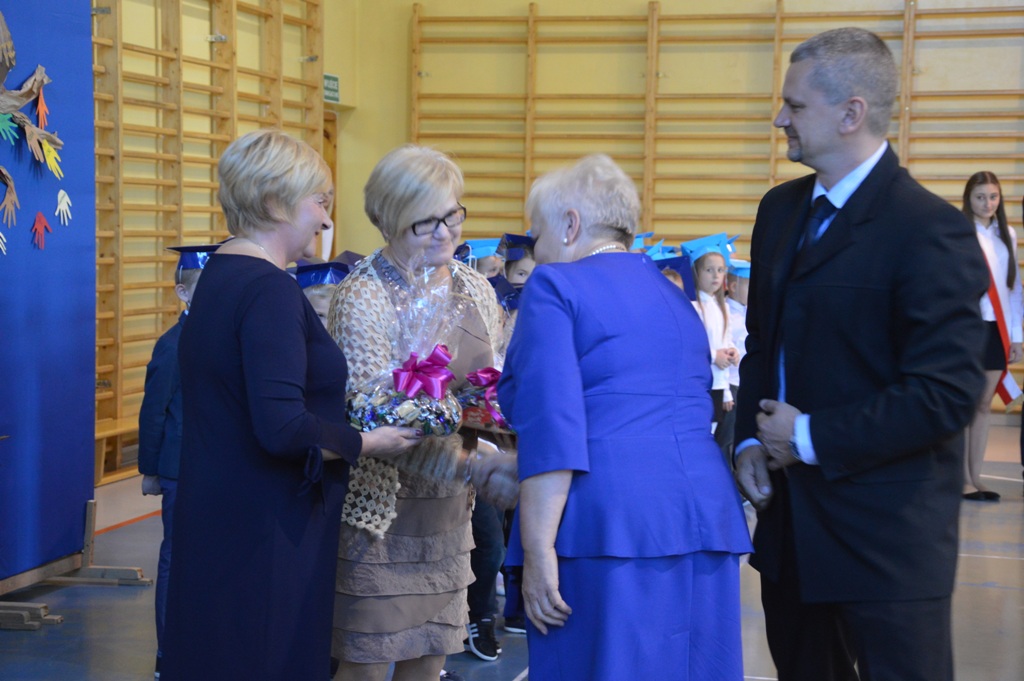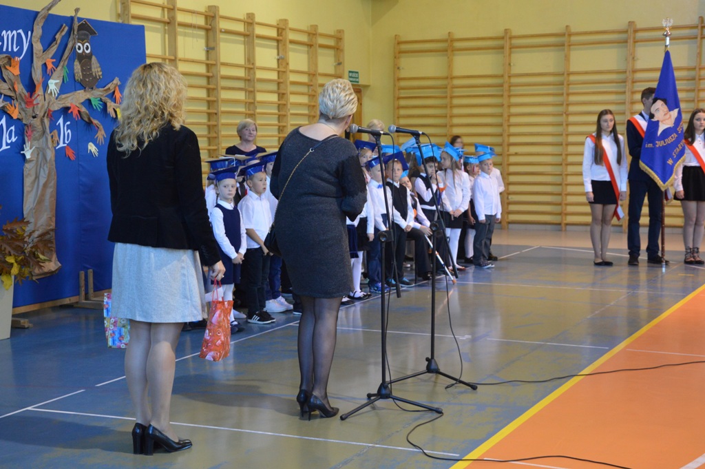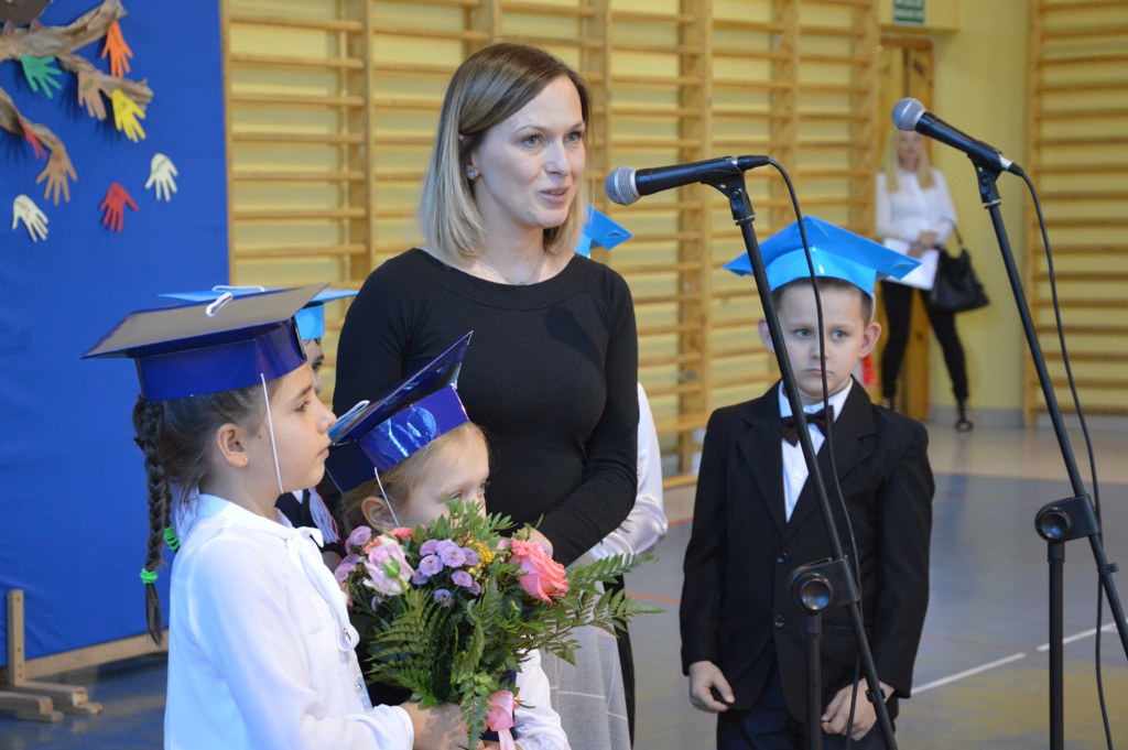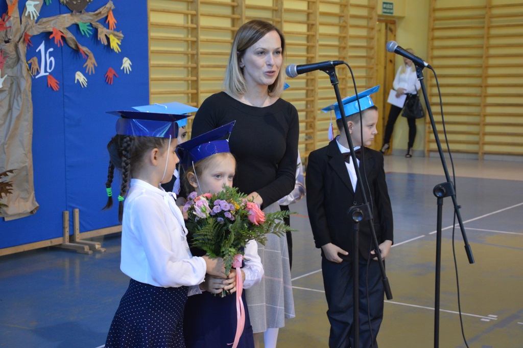Szczególnie miłym akcentem było wręczenie na ręce wychowawców – p. Bożeny Bielak i p. Stanisławy Bielak, upominków dla uczniów klas pierwszych. Słodkości, i nie tylko, wręczyli: przewodnicząca Rady Miejskiej, p. Ewa Zielińska, przewodnicząca Rady Rodziców, p. Anna Tokarczyk oraz przewodniczący Uczniowskiej Rady Szkolnej, Artur Janusz.