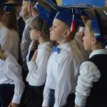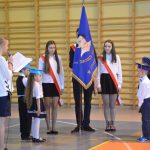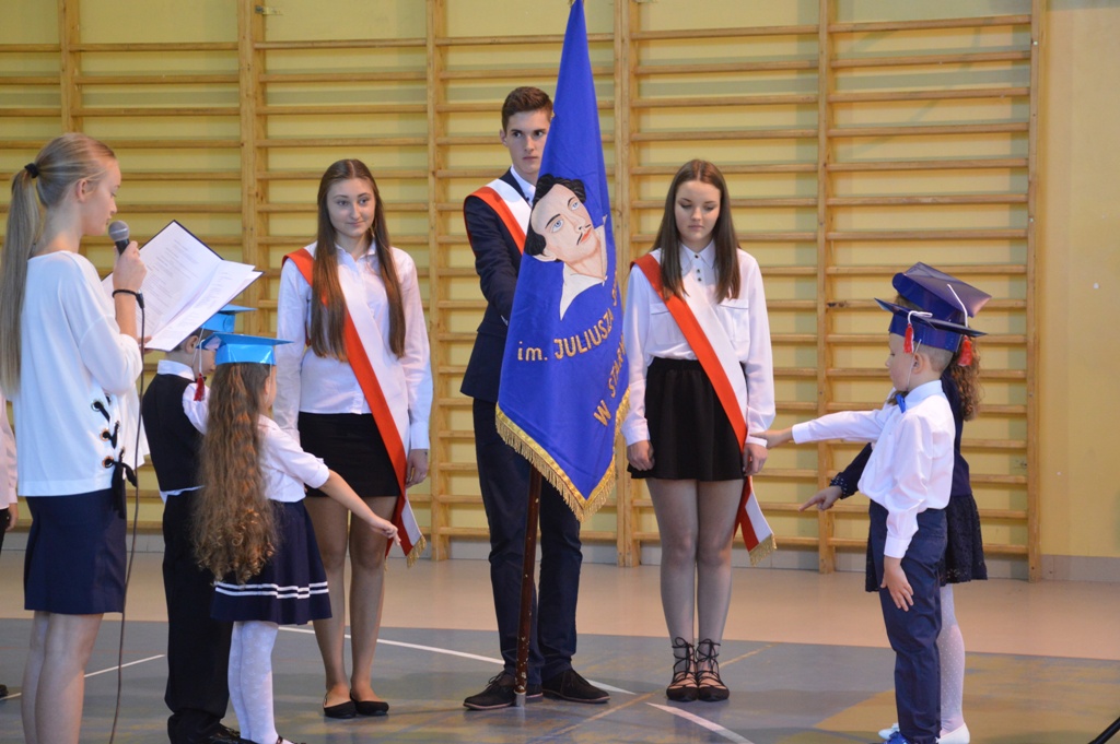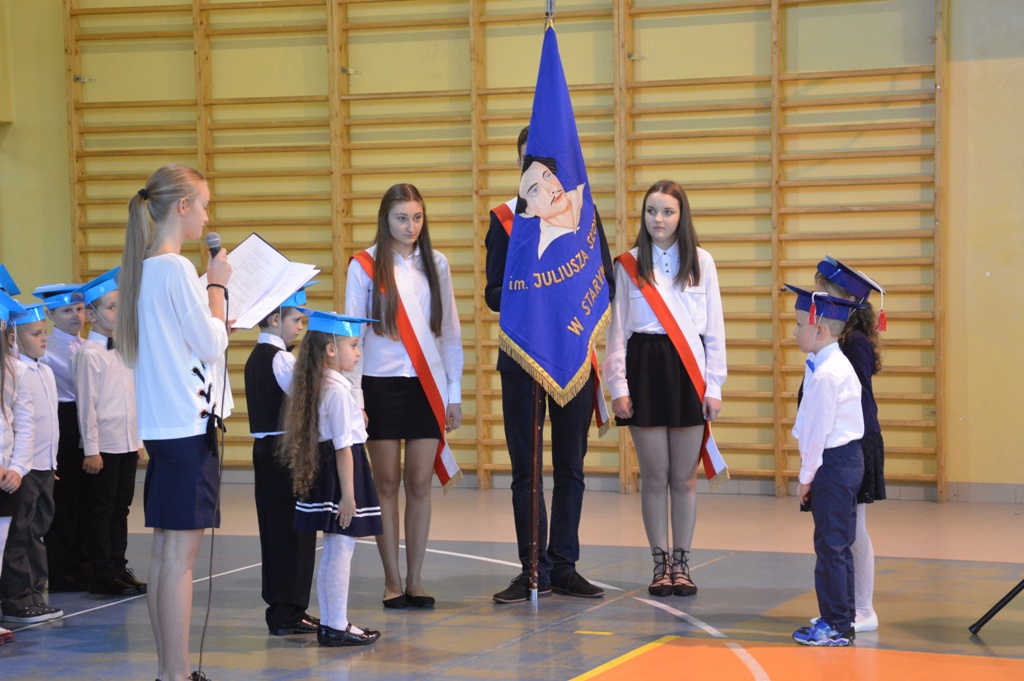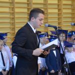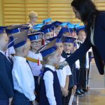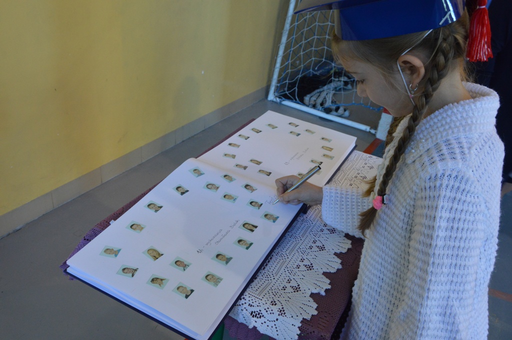 Nienaganną postawę uczniowską dzieci wykazały również w momencie, gdy pani Dyrektor, Wioletta Nowak, pasowała ogromnym ołówkiem każdego pierwszaka na ucznia SP nr 2 im. Juliusza Słowackiego w Starym Sączu. Następnie przedstawiciele klasy 1a i 1b złożyli pamiątkowe podpisy w Kronice Szkolnej.