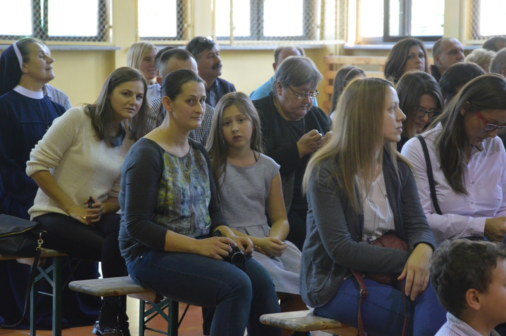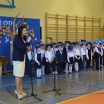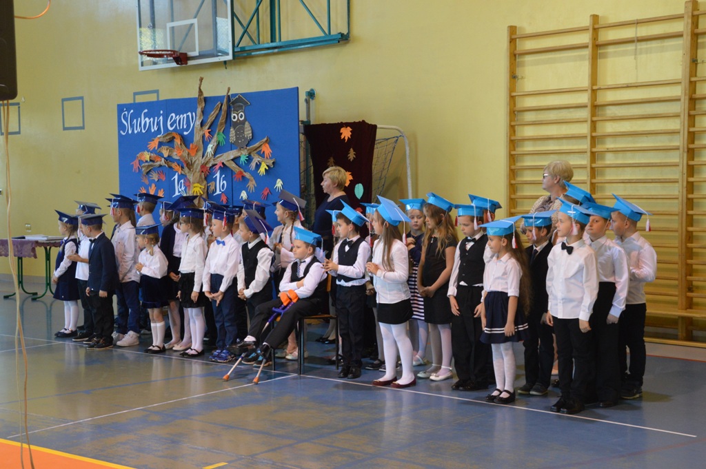 Nadszedł wreszcie ten piękny dzień, kiedy nasze „pierwszaczki” mogły złożyć ślubowanie w obecności pań Dyrektorek, pań Wychowawczyń, licznie zgromadzonych rodziców i zaproszonych gości. Długo się do tego dnia przygotowywały ucząc się wierszyków, piosenek, hymnu szkoły, uczestnicząc w wielu próbach. Ale też i efekt był wspaniały – dzieci doskonale dały sobie radę z zadaniem aktorskim, zachwycając swoich rodziców, nauczycieli i gości. A kiedy Maksiu i Kacperek mówili, że „boją się pasowania, bo nie wiedzą, jaki pas pani Dyrektor przyniosła dziś do szkoły” – po sali przeszła salwa śmiechu. Kiedy przyszedł czas na złożenie ślubowania, pierwszaczki bardzo przejęte, głośno i wyraźnie przyrzekły „uczyć się pilnie i systematycznie, zachowywać się wzorowo, być dobrym, uczciwym i koleżeńskim, pomagać innym w potrzebie oraz okazywać szacunek innym”. Niejednemu rodzicowi łza się w oku zakręciła, gdy patrzył na swoją pociechę składającą tak ważne obietnice.