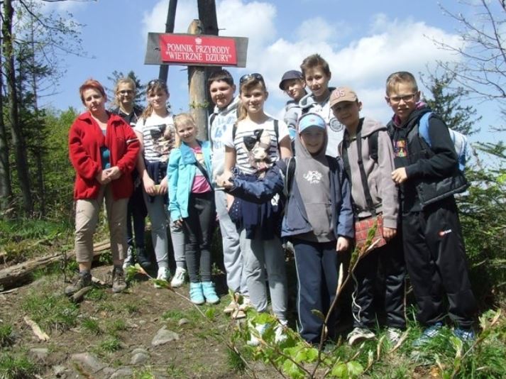 Naszą wędrówkę rozpoczęliśmy o 8 rano sprzed budynku szkoły w Przysietnicy. Wyruszyliśmy dobrze znaną nam drogą na Wygony, kierując się na niebieski szlak turystyczny. Nasza grupa, łącznie z opiekunami liczyła 17 osób, a stanowiły ją połączone siły uczniów szkoły podstawowej i gimnazjum. Szlak turystyczny, do którego bez problemu dotarliśmy, prowadził nas malowniczą drogą. Z góry mogliśmy podziwiać panoramę Przysietnicy oraz sąsiednich miejscowości. Dociekliwi uczniowie, szczególnie ze szkoły podstawowej konfrontowali swoją, zdobytą w czasie lekcji wiedzę przyrodniczą, z tym, co spotkaliśmy na trasie naszej wędrówki, a więc nazwami drzew, skał, owadów. Wszystko to korygowała wędrująca z grupą pani od przyrody. To oczywiście cieszy, a jednocześnie dowodzi, że „nauka nie poszła w las” (i tu nie trzeba brać tego powiedzenia dosłownie, wszak byliśmy w lesie). Idąc w górę, minęliśmy urokliwy rezerwat przyrody – Wietrzne Dziury. Oczywiście uwieczniliśmy ten fakt na pamiątkowych zdjęciach. Po ponad trzygodzinnej wędrówce (z licznymi odpoczynkami), dotarliśmy na Przehybę. Tam oczywiście najpierw zjedliśmy „turystyczny obiad”, czyli kanapki, które na takiej wysokości i w takim otoczeniu przyrody smakowały wyjątkowo. Potem mogliśmy podziwiać rozciągające się ze szczytu wspaniałe widoki na Tatry, Pieniny, Beskid Sądecki i planować kolejne wędrówki. Na trasę powrotną wybraliśmy żółty szlak, który biegnie przez Przysietnicę, w stronę Moszczenicy i dochodzi do Starego Sącza. Trasę nieco zmodyfikowaliśmy i zeszliśmy na drogę, zresztą bardzo widokową, prowadzącą do centrum wsi. Po drodze rozstawaliśmy się z kolejnymi uczestnikami naszego wędrowania. Wyglądało, że wszyscy, choć zmęczeni byli bardzo zadowoleni, bo dopytywali o kolejną wycieczkę.