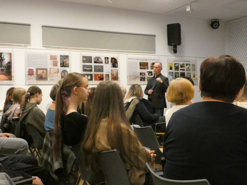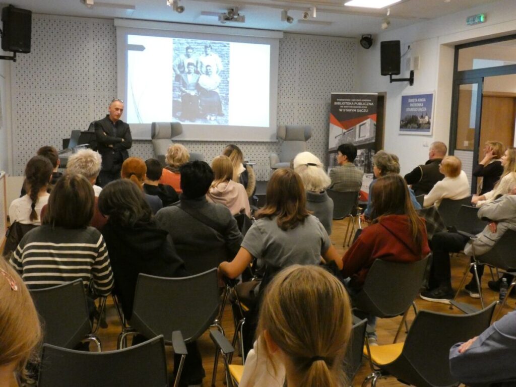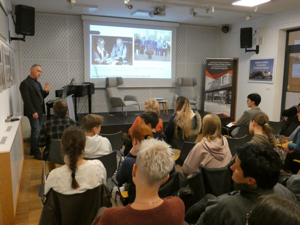 W ramach wdrażanego w SP 1 autorskiego programu edukacyjnego „Odyseja pamięci”, podejmującego tematykę pielęgnowania pamięci o Zagładzie, uczniowie klas 7 a i 7 b w dniu 29 października 2025 roku uczestniczyli w prelekcji „Holocaust na Sądecczyźnie” z udziałem Artura Franczaka – absolwenta Wydziału Historii Uniwersytetu Jagiellońskiego, wiceprezesa „Sądeckiego Sztetla”.