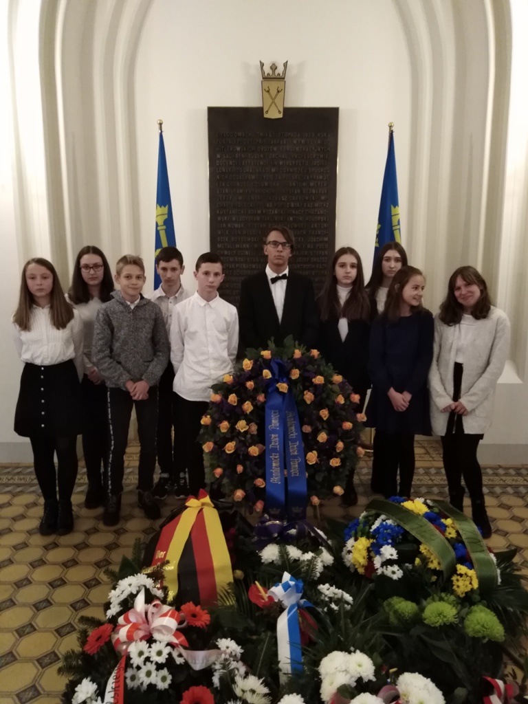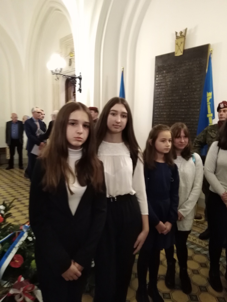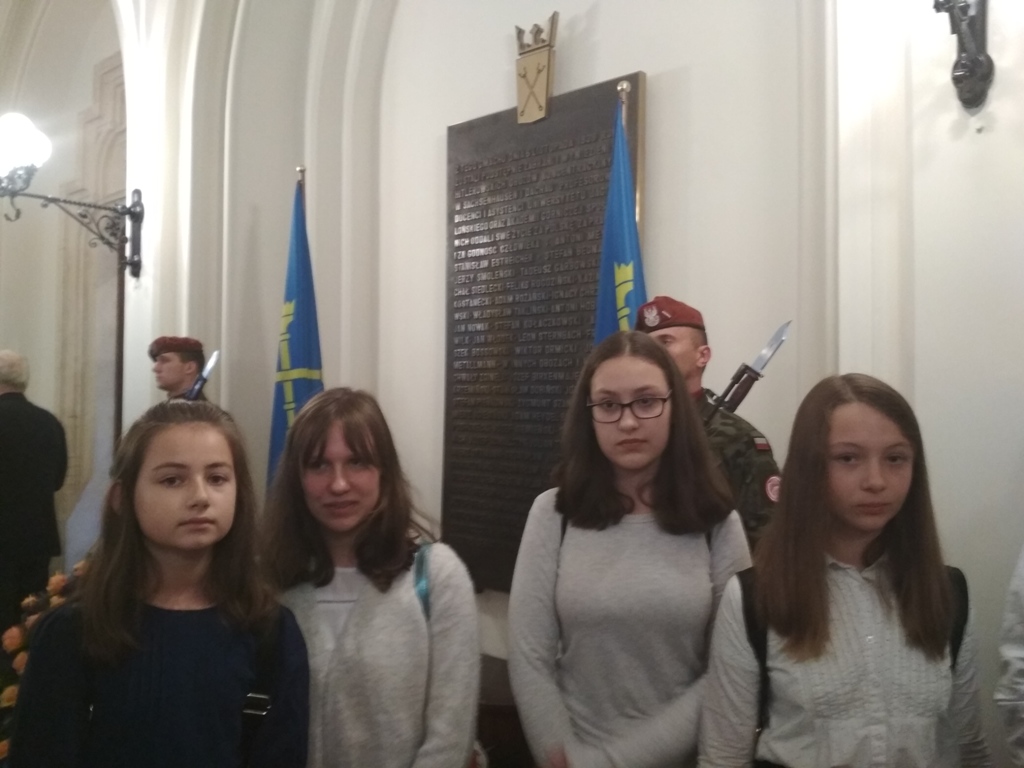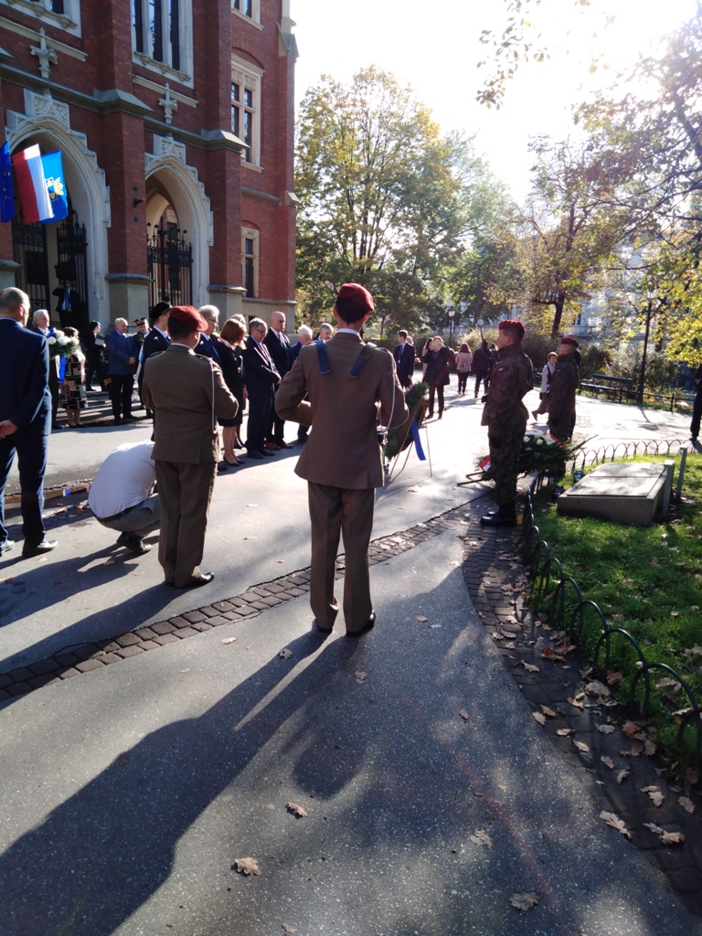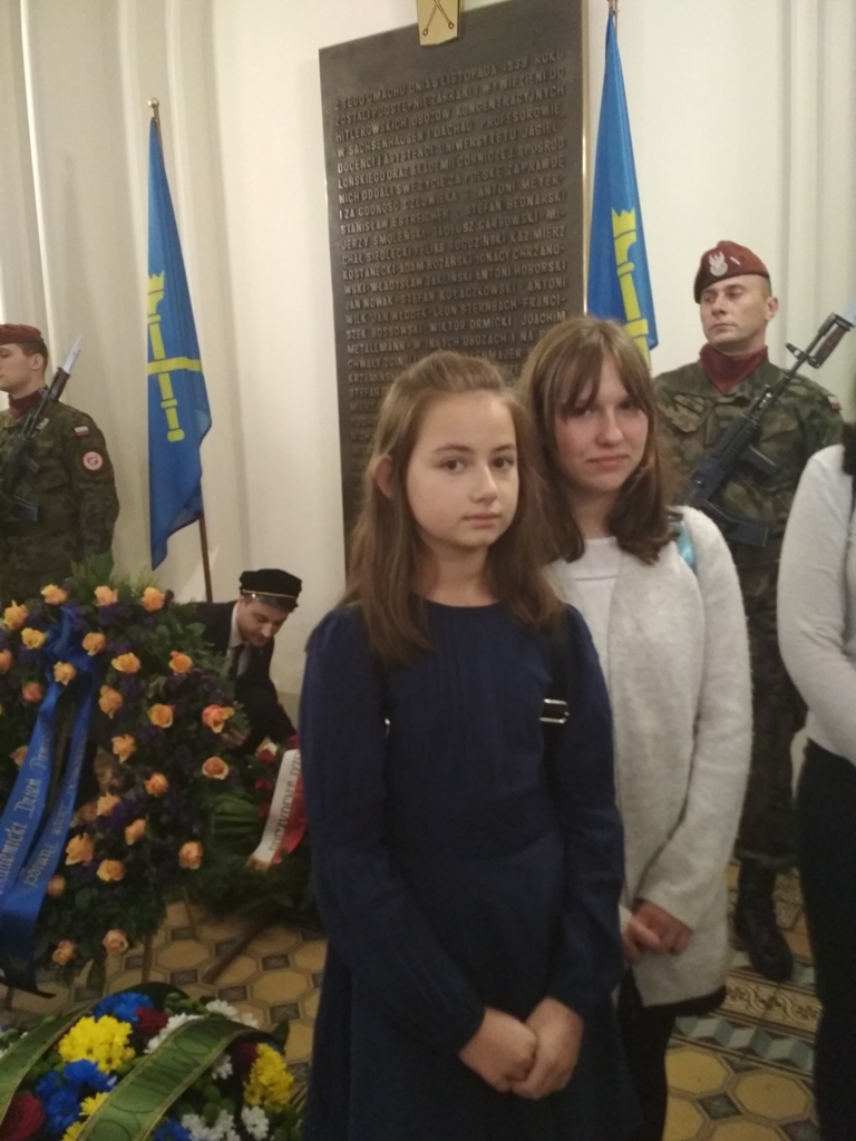 Uczestnicy projektu „Przygoda z nauką w murach UJ” reprezentowali także – wyróżnioną zaproszeniem – SP1 w uroczystym Apelu Pamięci. Młodzież starosądeckiej „1” towarzyszyła również Rektorowi UJ prof. dr. hab. med. Panu Wojciechowi Nowakowi w trakcie składania wieńców przy tablicach pamiątkowych w Collegium Novum UJ: ku pamięci ofiar Sonderaktion Krakau, ku czci pomordowanych profesorów Uniwersytetu Jana Kazimierza we Lwowie ( bestialsko zastrzelonych na Wzgórzu Wuleckim), ku czci ofiar Katynia oraz przy Dębie Wolności.