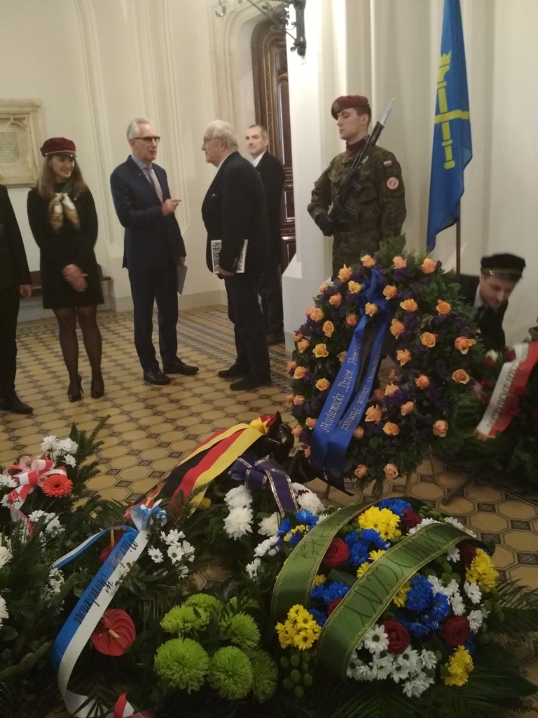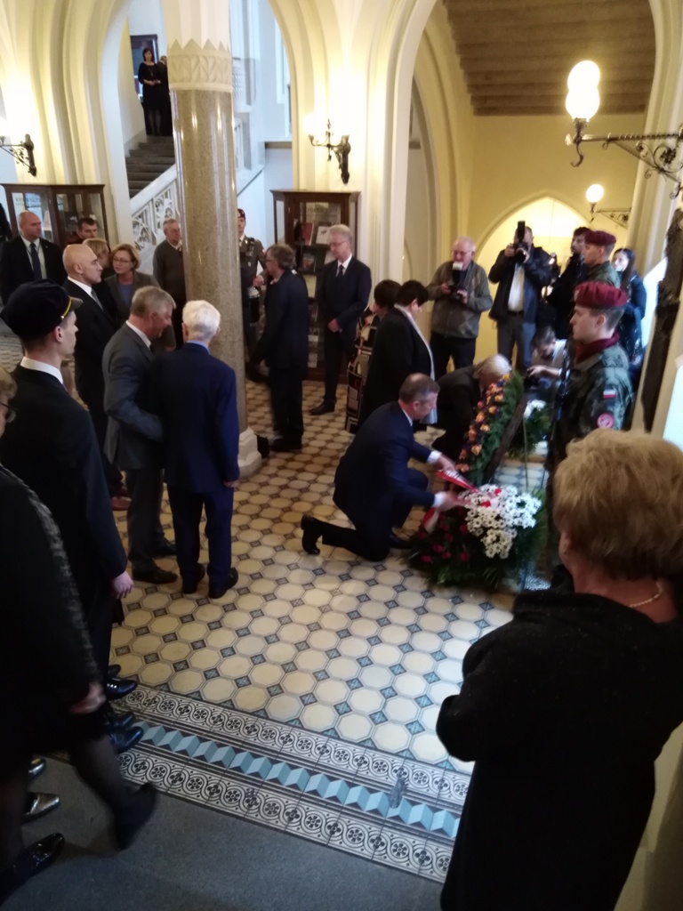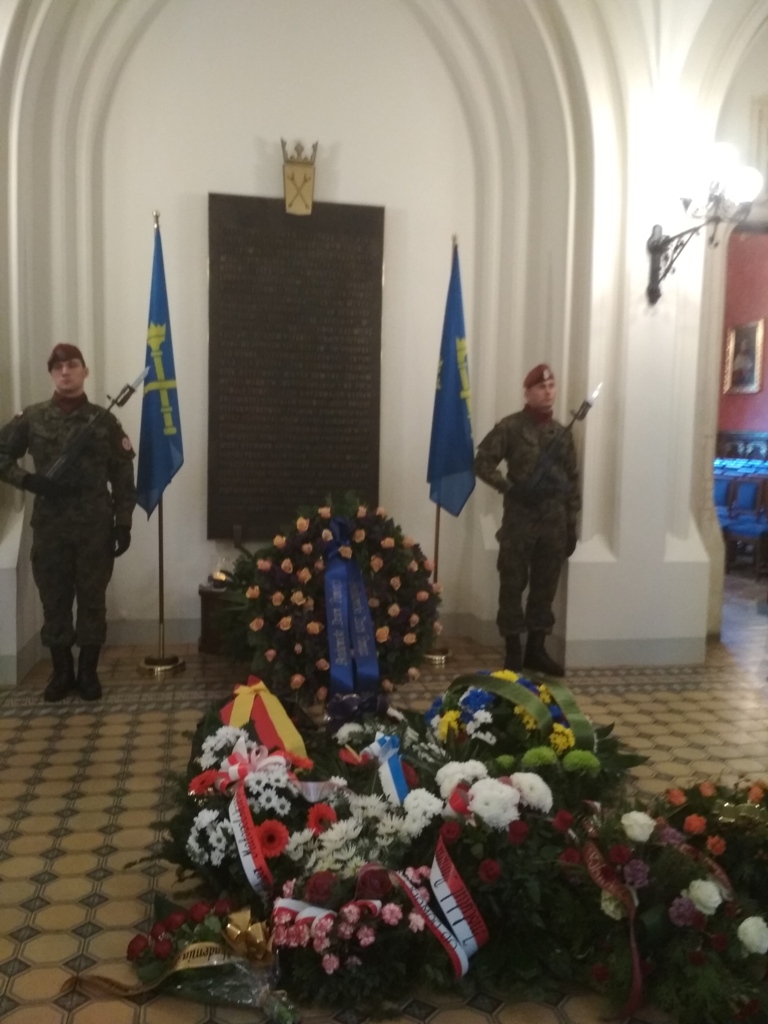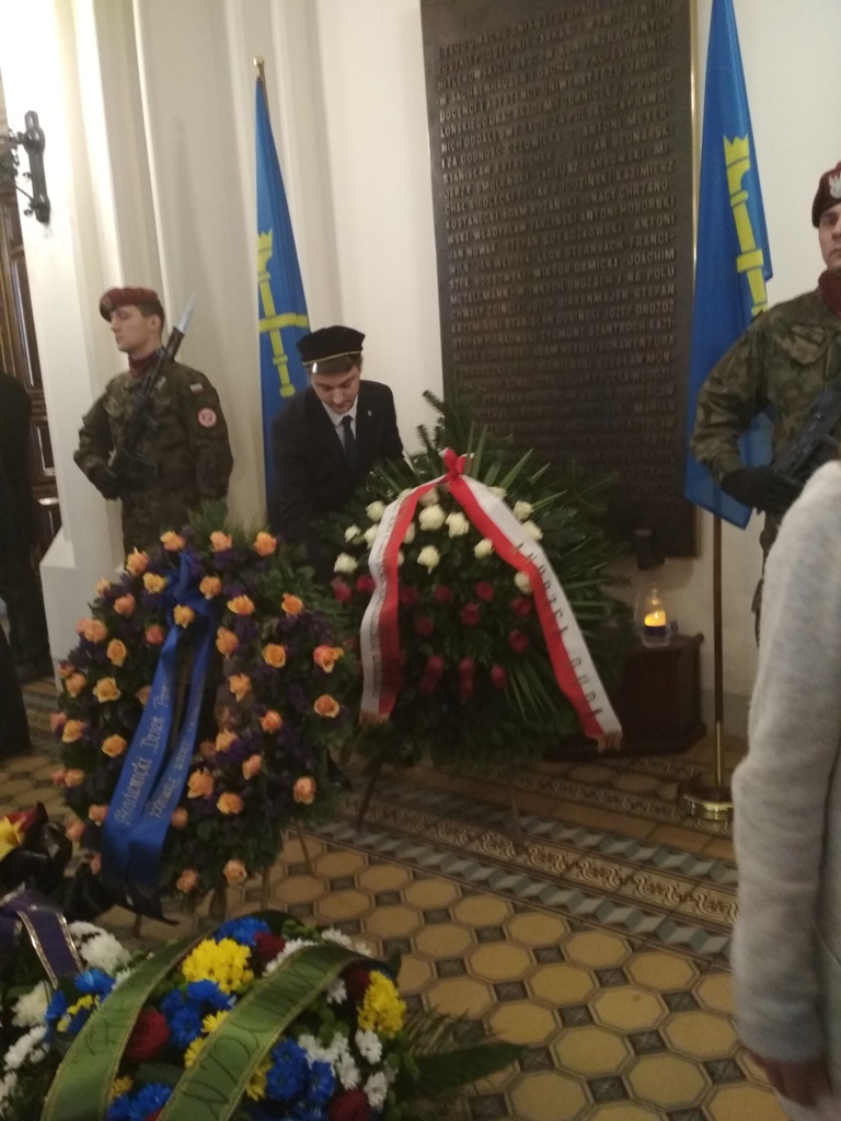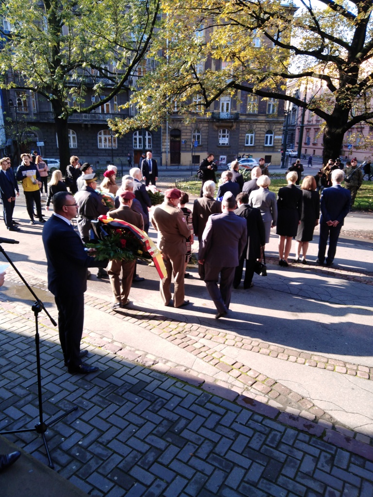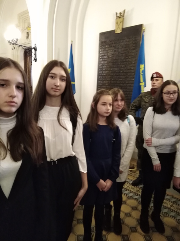 Uczestnicy projektu „Przygoda z nauką w murach UJ” reprezentowali także – wyróżnioną zaproszeniem – SP1 w uroczystym Apelu Pamięci. Młodzież starosądeckiej „1” towarzyszyła również Rektorowi UJ prof. dr. hab. med. Panu Wojciechowi Nowakowi w trakcie składania wieńców przy tablicach pamiątkowych w Collegium Novum UJ: ku pamięci ofiar Sonderaktion Krakau, ku czci pomordowanych profesorów Uniwersytetu Jana Kazimierza we Lwowie ( bestialsko zastrzelonych na Wzgórzu Wuleckim), ku czci ofiar Katynia oraz przy Dębie Wolności.