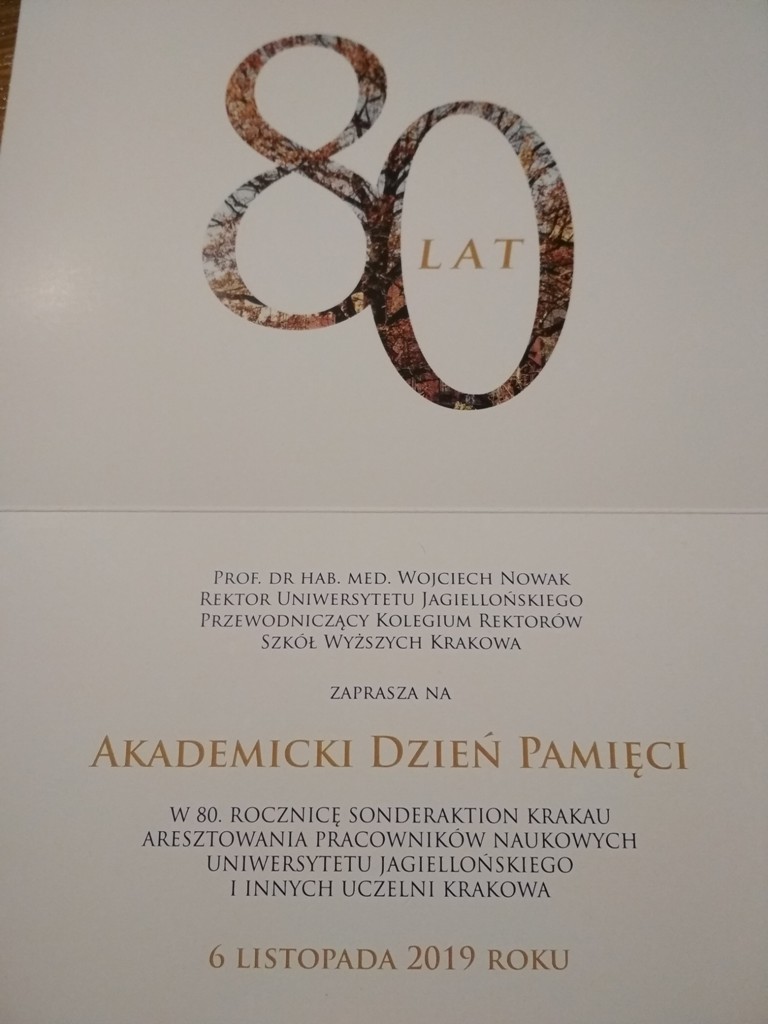 Społeczność akademicka Uniwersytetu Jagiellońskiego każdego roku wspomina w dniu 6 listopada rocznicę Sonderaktion Krakau – podstępnej akcji gestapo z 1939 roku, w wyniku której 183 krakowskich profesorów i innych nauczycieli akademickich, w tym 155 pracowników Uniwersytetu Jagiellońskiego, zostało aresztowanych, a następnie wywiezionych do obozów koncentracyjnych w Sachsenhausen i Dachau, gdzie kilkunastu z nich straciło życie.