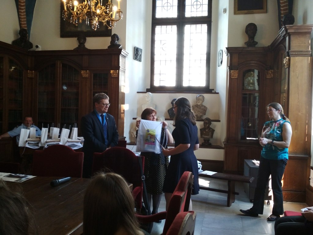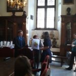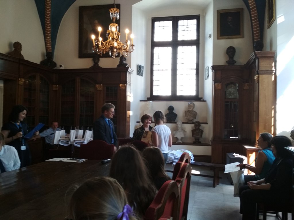 Uroczystą galę szkół, podczas której wręczono uczestnikom projektu i konkursu nagrody oraz wyróżnienia, zaplanowano w jednej z najbardziej reprezentacyjnych auli Alma Mater JagiellonicaLibrarii, w której odbywają się comiesięczne posiedzenia Senatu UJ z udziałem Rektora Uniwersytetu Jagiellońskiego prof. dr. hab. med. Wojciecha Nowaka. Bohaterami dnia byli finaliści konkursu reprezentujący klasę VI a, VI b, VI c i VII b: Julia Jasińska, Zuzanna Batko, Wiktoria Bołoz, Martyna Hopek i Kacper Rogalski. Młodzieży SP1 towarzyszyła studentka Emilia Deja – na co dzień uczennica klasy VI a – odbierająca wspólnie z koordynatorkami inicjatywy wyróżnienie dla starosądeckiej SP1 honorujące znakomite wyniki uczestników konkursu. Nagrody i dyplomy ambitnym „studentom” wręczyli: Pani mgr Wioletta Kolbusz Lasa reprezentująca Collegium Maius UJ oraz przedstawicielki Akademii Żakowskiej: Pani mgr Aleksandra Rzońca i Pani mgr Urszula Malczyk, a także krakowski uczony – polski historyk i armenolog, profesor nauk humanistycznych, pracownik naukowy Instytutu Historii Collegium Witkowskiego Uniwersytetu Jagiellońskiego – prof. dr hab. Krzysztof Stopka, który złożył uczestnikom projektu gratulacje, życząc pasjonującej przygody z nauką w przyszłości.