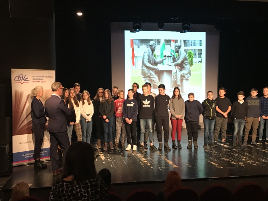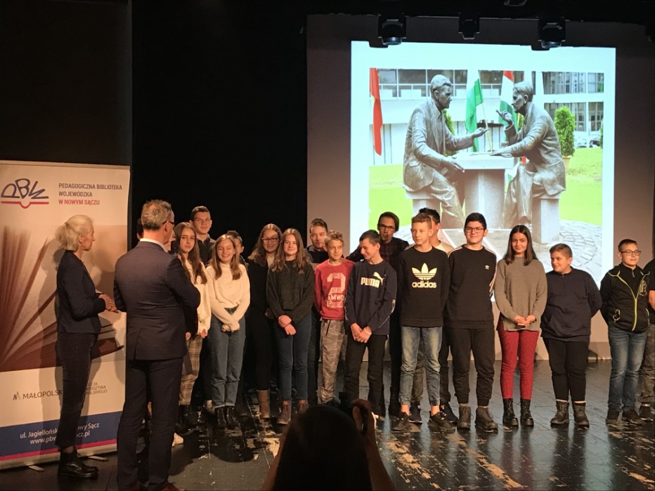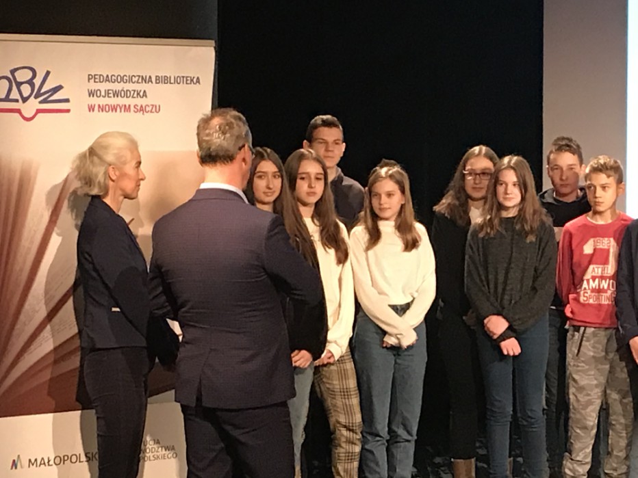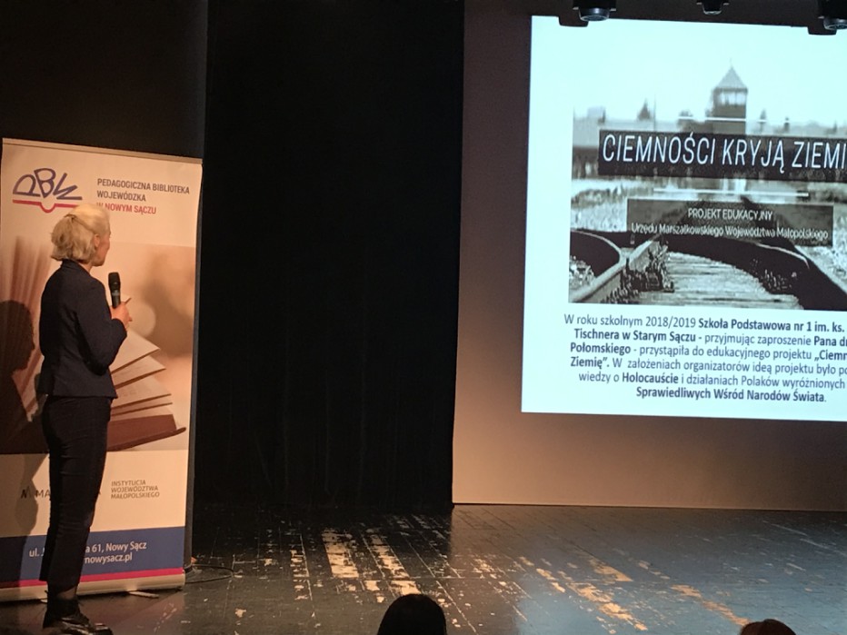 Starosądecka SP1 znalazła się – obok instytucji tj. Gimnazjum im. ks. Stanisława Konarskiego w Grybowie, Zespół Szkół nr 2 w Dąbrowie Tarnowskiej i Liceum Ogólnokształcące nr 1 im. Jana Długosza w Nowym Sączu – w gronie czterech szkół wyróżnionych zaproszeniem do publicznego zaprezentowania inicjatyw edukacyjno – wychowawczych zaproponowanych uczestnikom projektu i wdrażanych w SP1. W roli prelegentki wystąpiła szkolna koordynator projektu – pani Jadwiga Postawa, prezentując multimedialne sprawozdanie przygotowane przy współudziale pani Renaty Jasińskiej – Nowackiej. Gratulując organizatorom wartościowej inicjatywy, szkolna koordynator projektu złożyła podziękowania młodzieży uczestniczącej w historycznej edukacji oraz Dyrekcji SP1 – sojusznikowi dydaktycznego programu. Honorując wkład SP1 w realizację przedsięwzięcia, marszałek Leszek Zegzda oraz dyrektor Artur Franczak wyrazili uznanie za zaangażowanie instytucji w różnorodność edukacyjnych inicjatyw promujących wartości takie jak: empatia, szacunek dla człowieka, otwartość i odpowiedzialność za przyszłość.