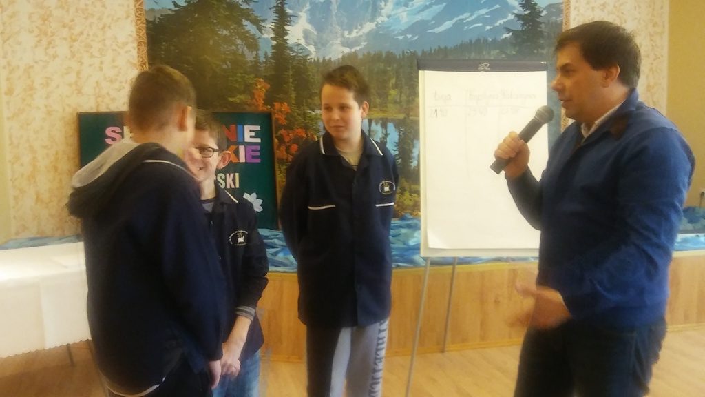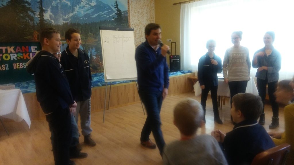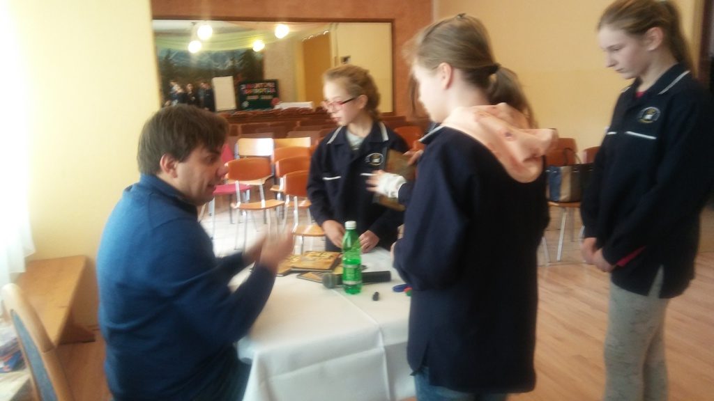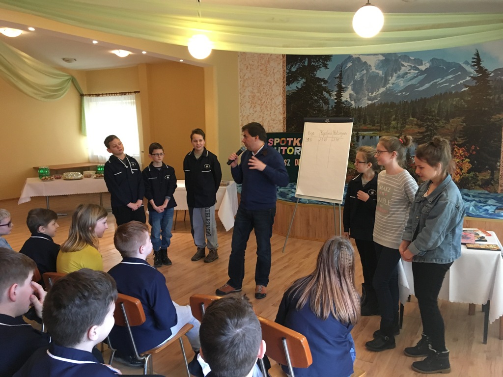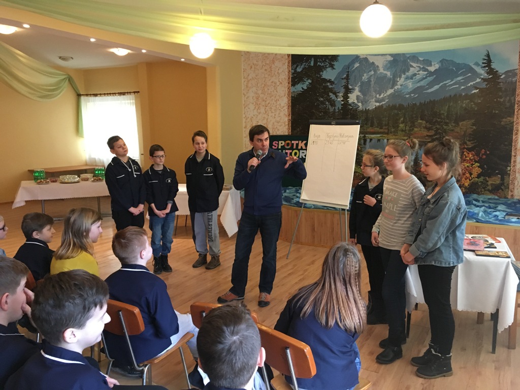 Po przywitaniu pan Łukasz Dębski zaproponował dzieciom „hardkorowe zabawy”, czym od razu zaskarbił sobie przychylność i uwagę młodych czytelników. Autor odczytywał utwory z Wierszownika z podróży dookoła świata, dzięki czemu zabierał młodych słuchaczy w podróż w wyobraźni po różnych krajach, nie tylko europejskich. Uczniowie z bohaterami wierszy, najczęściej zwierzęcymi, przemierzali kontynenty, zapamiętując elementy charakterystyczne dla danego państwa i bawiąc się przy tym doskonale. Literackie podróżowanie gość przeplatał z innymi zabawami: rymowankami, literackimi łamigłówkami. Dużą frajdę sprawiło dzieciom „wywołanie do tablicy” nauczycieli, którzy musieli odczytywać na czas wierszyki – łamańce językowe. Wielkie zaciekawienie zebranych wywołała zabawa w detektywów, podczas której dwie grupy uczniów, wcielających się w super agentów, musiały rozwiązać niełatwą zagadkę kryminalną. W tej konkurencji zwyciężyły dziewczęta, które nagrodzono rzęsistymi brawami.
