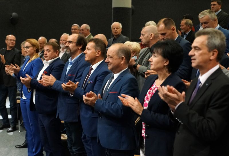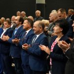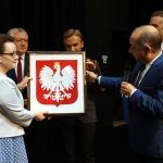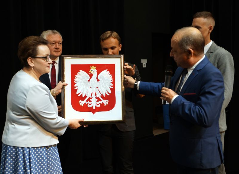 Na zakończenie spotkania starosta nowosądecki Marek Pławiak w imieniu sądeckich samorządowców wręczył pani Minister Godło Państwowe wykonane przez hafciarki z Bobowej.
