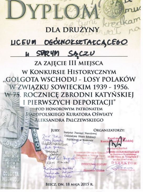 W dniu 18 maja 2015 roku odbył się finał konkursu „Golgota Wschodu – Losy Polaków w Związku Sowieckim 1939 – 1956. W 75-tą Rocznicę Zbrodni Katyńskiej i pierwszych deportacji” dla uczniów z miasta Nowego Sącza i powiatów gorlickiego, nowosądeckiego i limanowskiego.