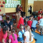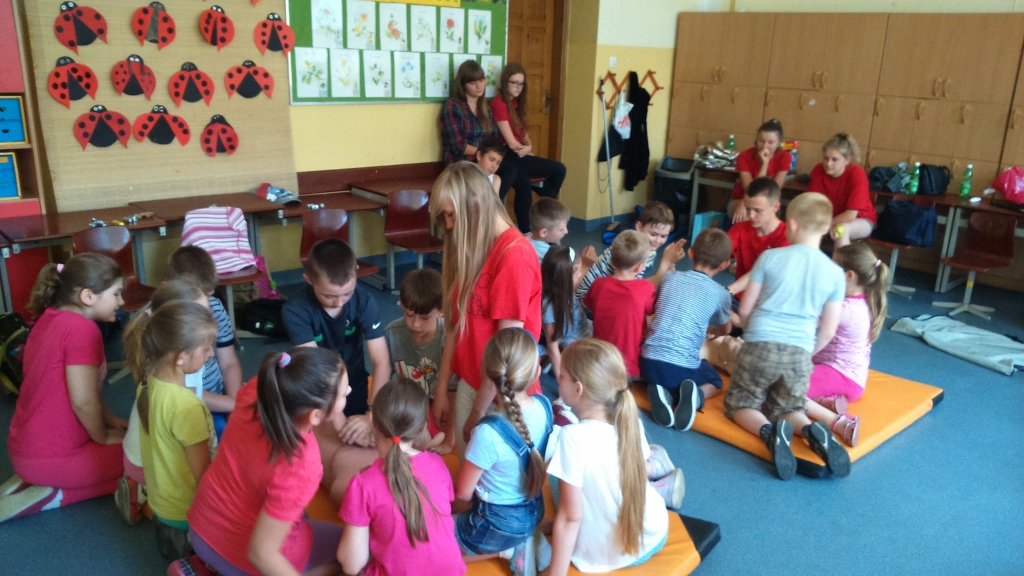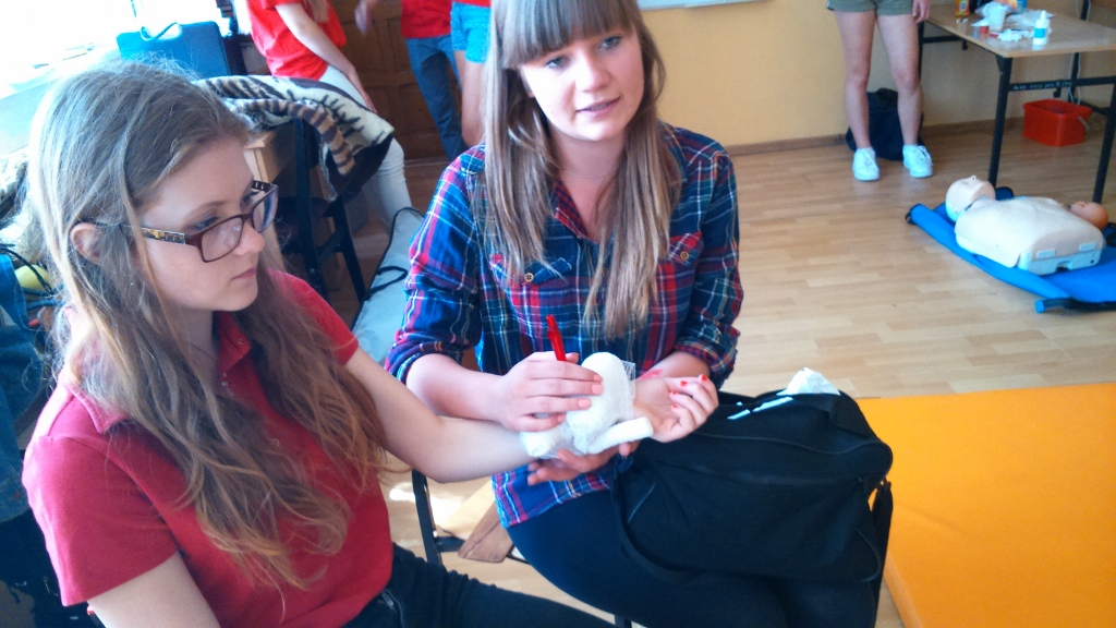 Marcin Mirek, Maria Lorczyk, Sara Brzeźny, Natalia Janik, Magdalena Rusnak i Kamila Dora dzielili się swoją wiedzą i umiejętnościami praktycznymi ze swoimi młodszymi kolegami i koleżankami. Uczniowie pokazywali i omawiali umiejętności zachowania się w wielu sytuacjach zagrażających życiu i zdrowiu, ze szczególnym uwzględnieniem sytuacji szkolnych. Dzieci nauczyły się fachowego wzywania służb ratunkowych, wyposażenia apteczki pierwszej pomocy, podchodzenia do osoby poszkodowanej na miejscu wypadku i kontroli funkcji życiowych, jak również udzielania pomocy przedmedycznej w sytuacji, gdy poszkodowany jest nieprzytomny, a więc układania go w pozycji bezpiecznej, zabezpieczania termicznego oraz kontrolowania jego oddechu. Dzieci zapoznały się z umiejętnością prowadzenia reanimacji krążeniowo – oddechowej u osoby dorosłej, dziecka i niemowlęcia. Ćwiczyły zachowanie ratunkowe podczas ataku padaczki, zadławienia, krwotoku z nosa, krwotoku z kończyn oraz złamań. Dzieci chętnie brały udział w zajęciach, odpowiadały na zadawane pytania i wykonywały zadane czynności praktyczne. Uczniowie liceum wzorowo sprawdzili się w roli nauczycieli – instruktorów. Zajęcia, jak co roku, spotkały się z dużym zainteresowaniem.