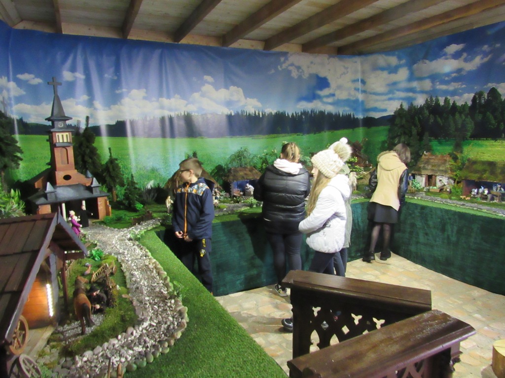 W budynku pobliskiej stodoły podziwiają ruchomą miniaturę wioski galicyjskiej z przełomów XIX i XX, ukazującą więc realia z życia codziennego wioski, w której żyła bł. Karolina. Elementy ruchome i dźwiękowe pobudzają wyobraźnię. Następnie na dwóch ławeczkach przed domem bł. Karoliny uczniowie znów współpracują w grupach i na papierowych zielonych liściach tworzą wskazówki dla swoich rówieśników jak dobrze i owocnie żyć, umieszczając je potem na brązowych konarach grusz znajdujących się na specjalnych planszach, które trafiają do każdej drużyny przed rozpoczęciem zadania. Na koniec warsztatów po odnalezieniu gruszy bł. Karoliny, która rośnie nieopodal jej domu, w pobliżu szlaku męczeństwa, obie drużyny dzielą się swoimi skojarzeniami zapisanymi na zielonych liściach. Symbolicznie, bo pod symboliczną gruszą w Wał Rudzie, powstają drogowskazy, dzięki którym uczniowie Szkoły Podstawowej nr 2 wracają do Starego Sącza bogatsi o wartościowe, osobiste przemyślenia.