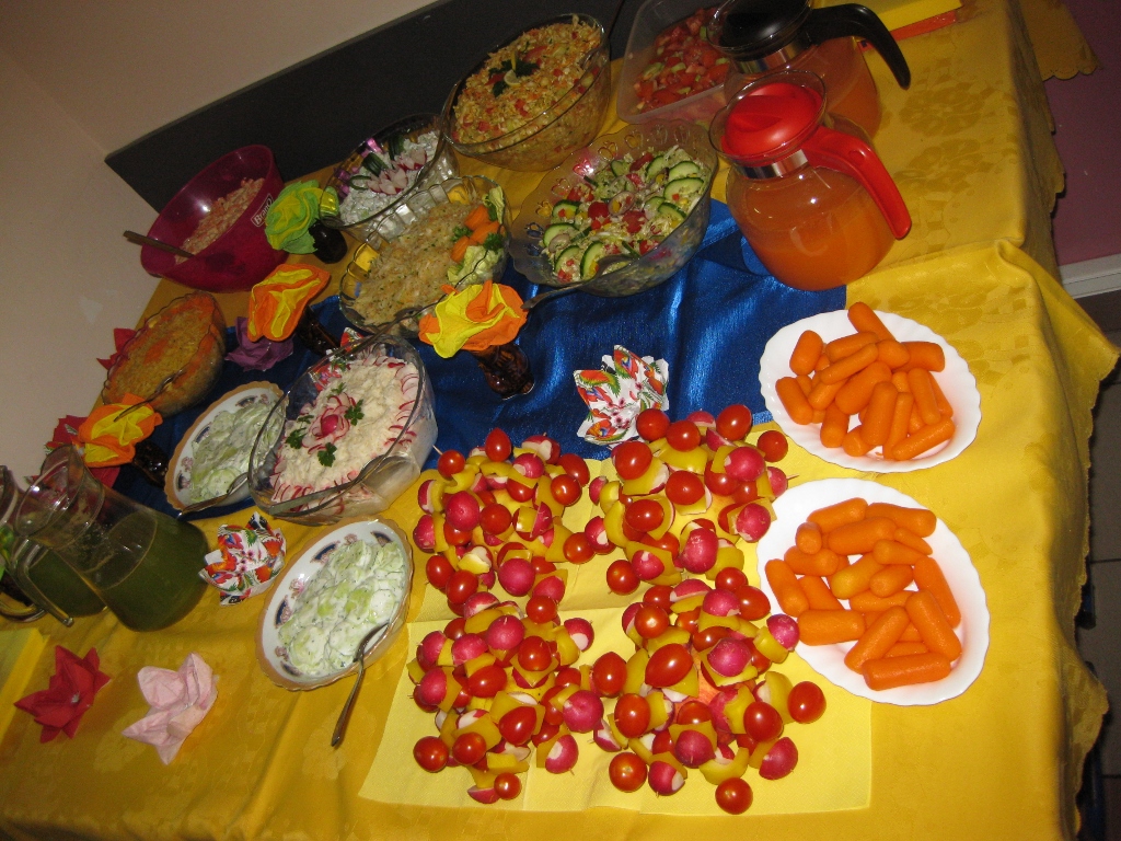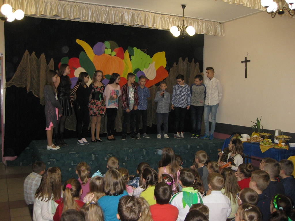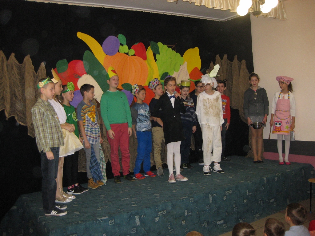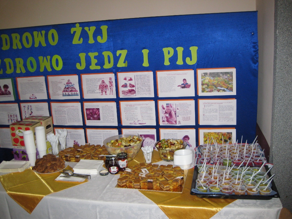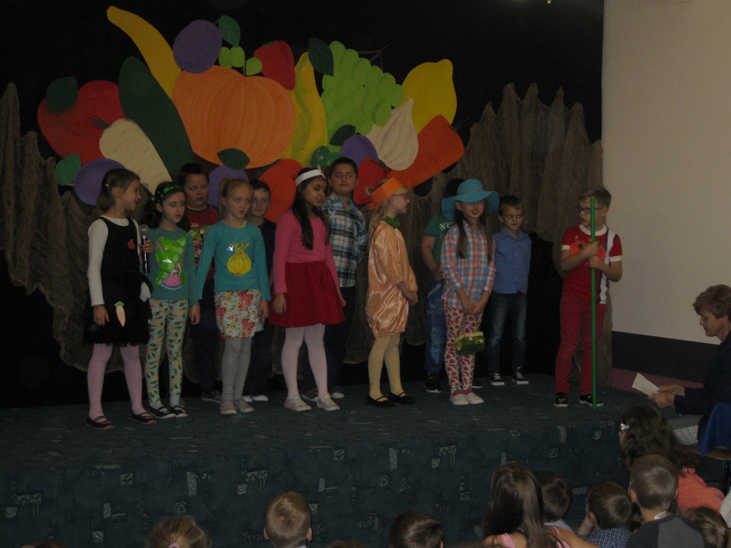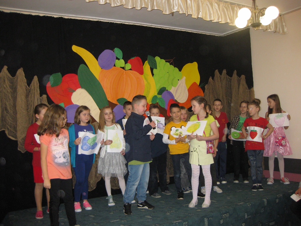 Na początku uczniowie przedstawiali „owocowo-warzywne” wiersze Jana Brzechwy: Chrzan, Ćwikła, Arbuz, Pomidor, Marchewka, Na straganie. Potem było coś dla ciała, czyli zdrowe rozkosze podniebienia. Mamy przygotowały przeróżne smakołyki, które niejednego niejadka mogły zachęcić do zjadania tego, co w „zwykłym”  wydaniu nie bardzo smakuje. Nie zabrakło również zdrowych deserów. Przepiękne owocowe dekoracje zrobiła mama, pani Danuta Sordyl Stawiarska.