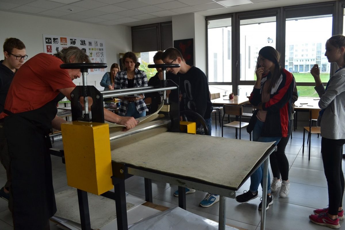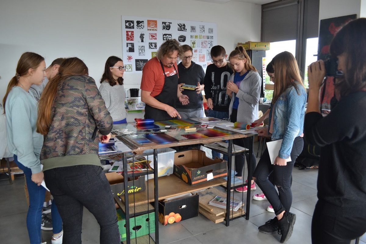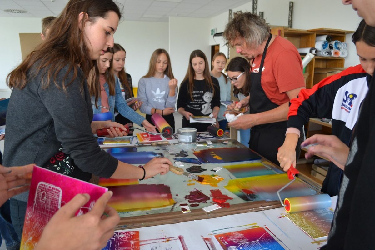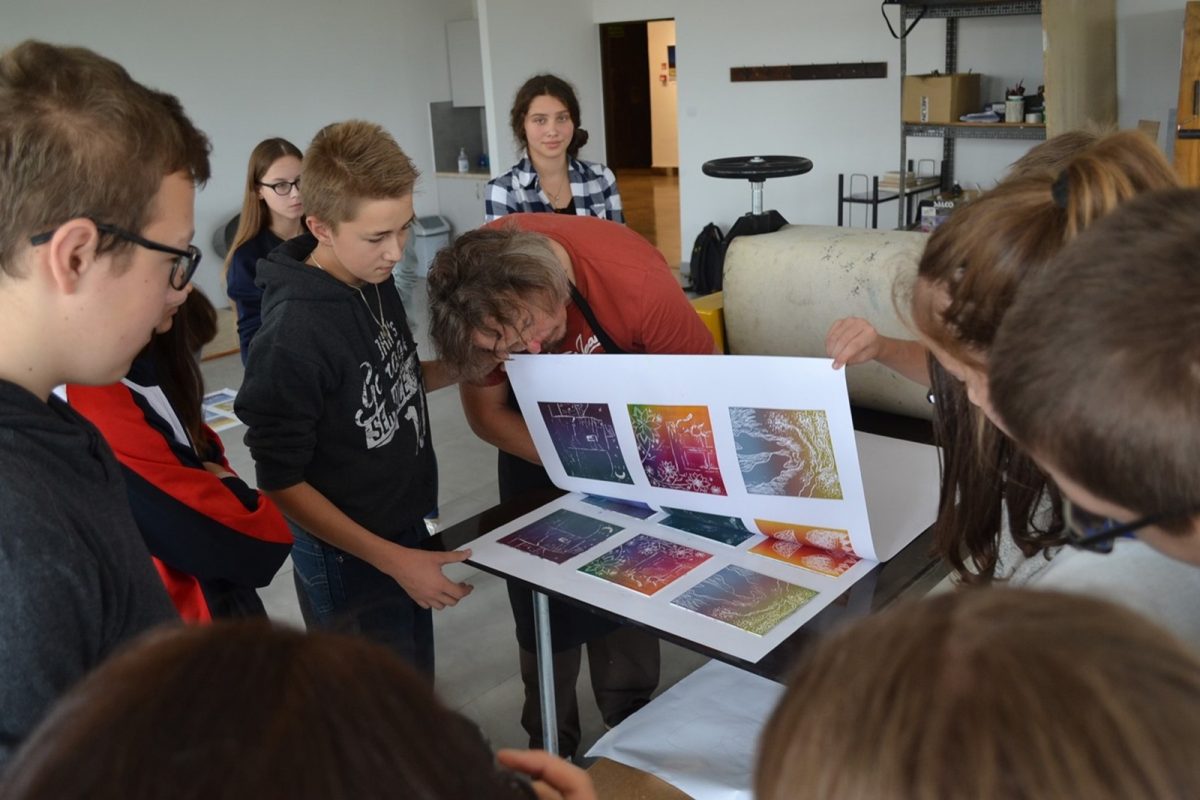13 października 2017 r. uczniowie z Gołkowic i Barcic, którzy biorą udział w projekcie „Synapsy – Spacery po śladach” pojechali do Nowohuckiego Centrum Kultury w Krakowie. Tam wzięliśmy udział w warsztatach z grafiki artystycznej przeprowadzonej przez Jana Bosaka. Gimnazjaliści mieli okazję działać w profesjonalnej pracowni graficznej i wykonywali odbitki swoich prac na prasie drukarskiej. Inspiracją do powstania tych wielokolorowych dzieł były legendy i postacie związane z miejscami, które odwiedzaliśmy podczas wycieczek. Bawiliśmy się świetnie!!!!!