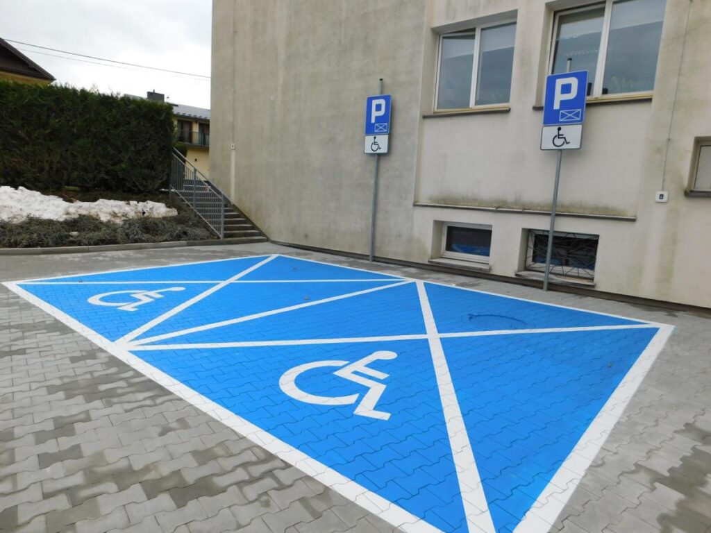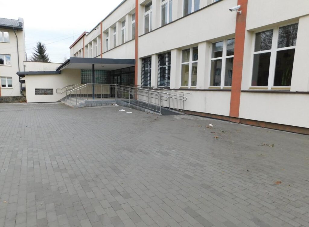 Inwestycja o wartości blisko 544 tys. zł objęła kompleksowe dostosowanie terenu od strony ul. Partyzantów. Zmodernizowano parking przy wejściu do szkoły, wyznaczając miejsca postojowe dla osób z niepełnosprawnościami oraz wymieniając nawierzchnię z kostki brukowej. Przebudowano także podjazd i schody prowadzące z chodnika na plac przed budynkiem, co znacząco poprawiło komfort i bezpieczeństwo poruszania się.