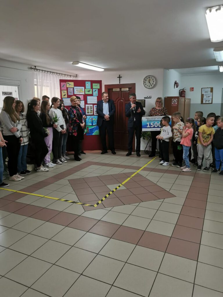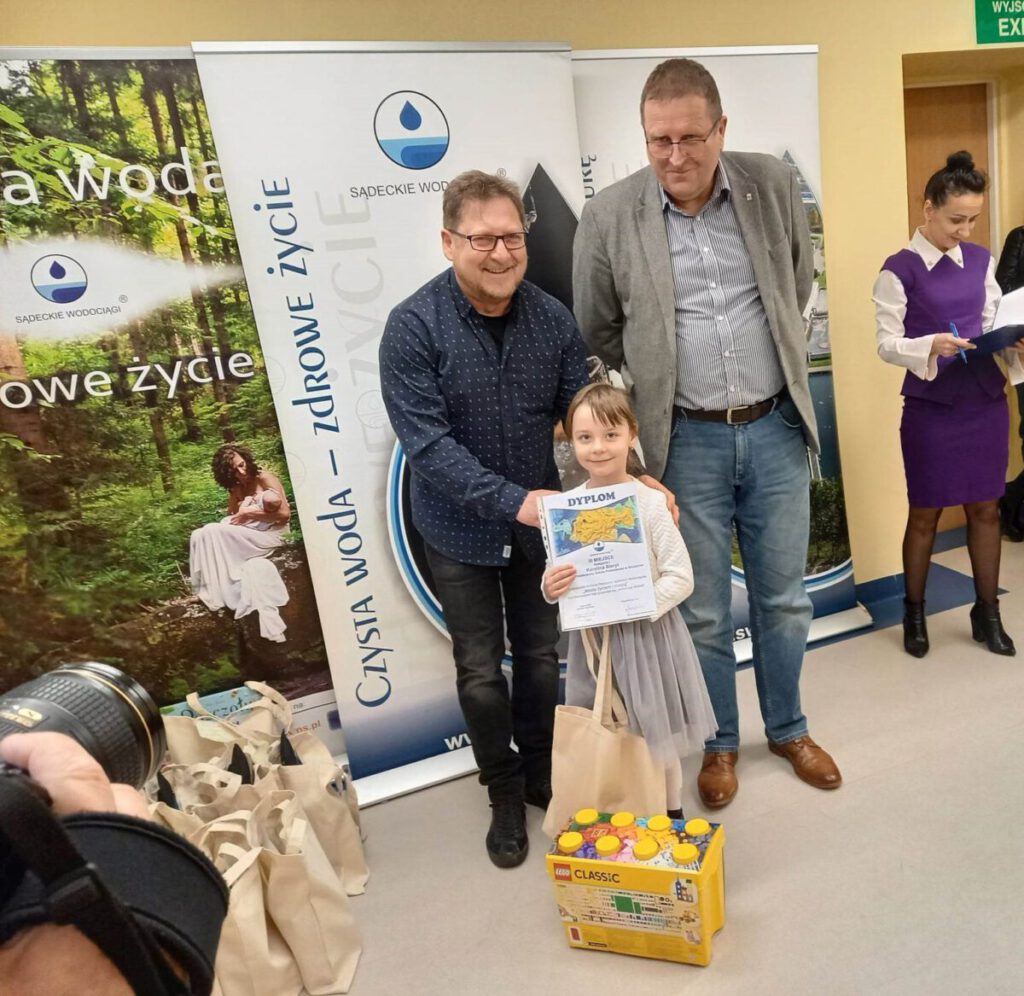 Natomiast Szkoła Podstawowa w Skrudzinie otrzymała nagrodę w wysokości 1500 zł. dla najlepszej szkoły w tegorocznej edycji ogólnopolskiego konkursu plastycznego „Woda życiem i magią”. Symboliczny czek przekazali szkole Dyrektor spółki Sądeckie Wodociągi, Pan Tadeusz Frączek oraz Pan Burmistrz Jacek Lelek, podczas wizyty w szkole w dniu 18 kwietnia 2023 roku.