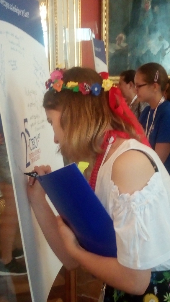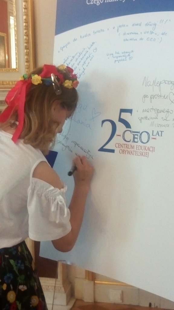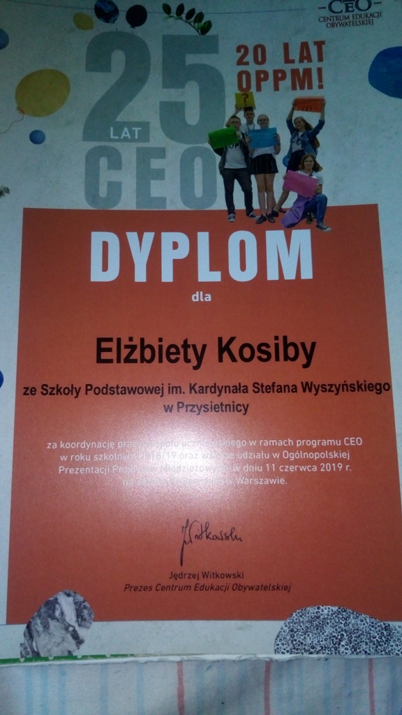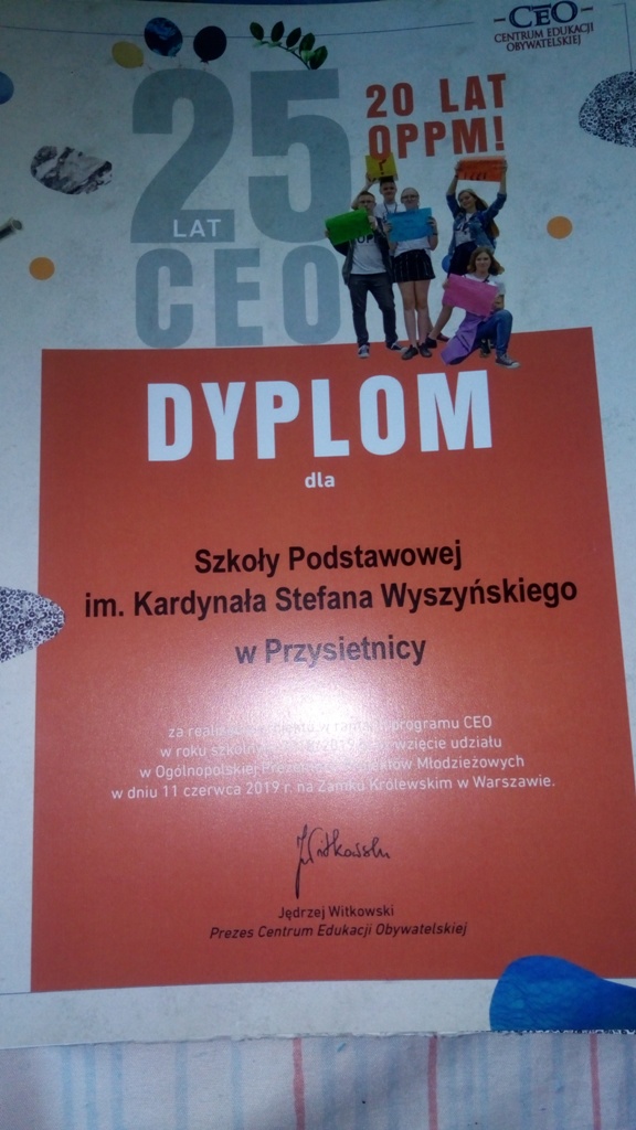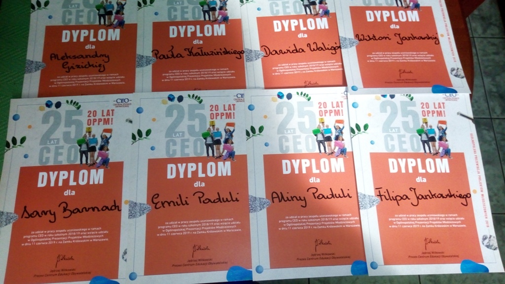 -Nasza ciężka praca zaowocowała kolejnym sukcesem- zostaliśmy zaproszeni na Ogólnopolską Prezentację Projektów Młodzieżowych do Warszawy połączoną z obchodami 25 lat istnienia CEO -mówi Elżbieta Kosiba – Na ogólnopolską prezentację z całej Polski zostało zaproszonych łącznie 65 szkół, a wśród nich była nasza szkoła. 11 czerwca 2019r dwa zespoły projektowe z naszej szkoły prezentowały się w Arkadach Kubickiego na Zamku Królewskim w Warszawie. Uroczyste otwarcie miało miejsce w Sali głównej balowej Zamku Królewskiego. Oficjalnego otwarcia dokonał prezes fundacji CEO Jędrzej Witkowski. Każdy zespół projektowy prezentował się przed ekspertami z realizacji wykonanych zadań. Na uwagę zasługuje fakt, iż naszą szkołę reprezentowały aż dwa zespoły projektowe ze względu na wyróżniające się działania. Dodatkowym zadaniem dla zespołów projektowych była także promocja swojego regionu. Nasze zespoły projektowe przygotowały wiele przysmaków pochodzących z naszego regionu. Ponadto na okoliczność tej uroczystości uczniowie przygotowali foldery o swojej szkole i miejscowości, piosenki, taniec oraz stroje regionalne. Podczas trwania OPPM-u uczniowie oraz ich opiekunowie mogli wymieniać ze sobą zdobyte doświadczenia w czasie realizacji podobnych i nowych zadań projektowych.