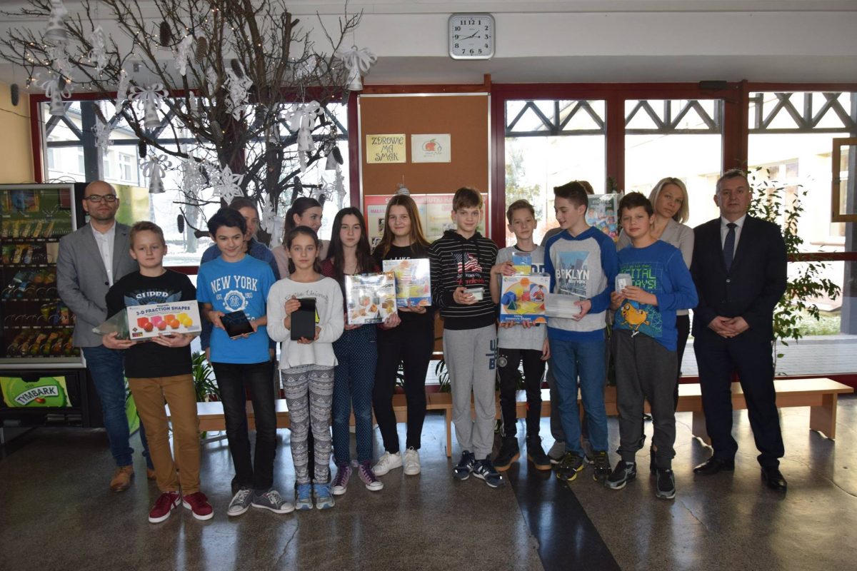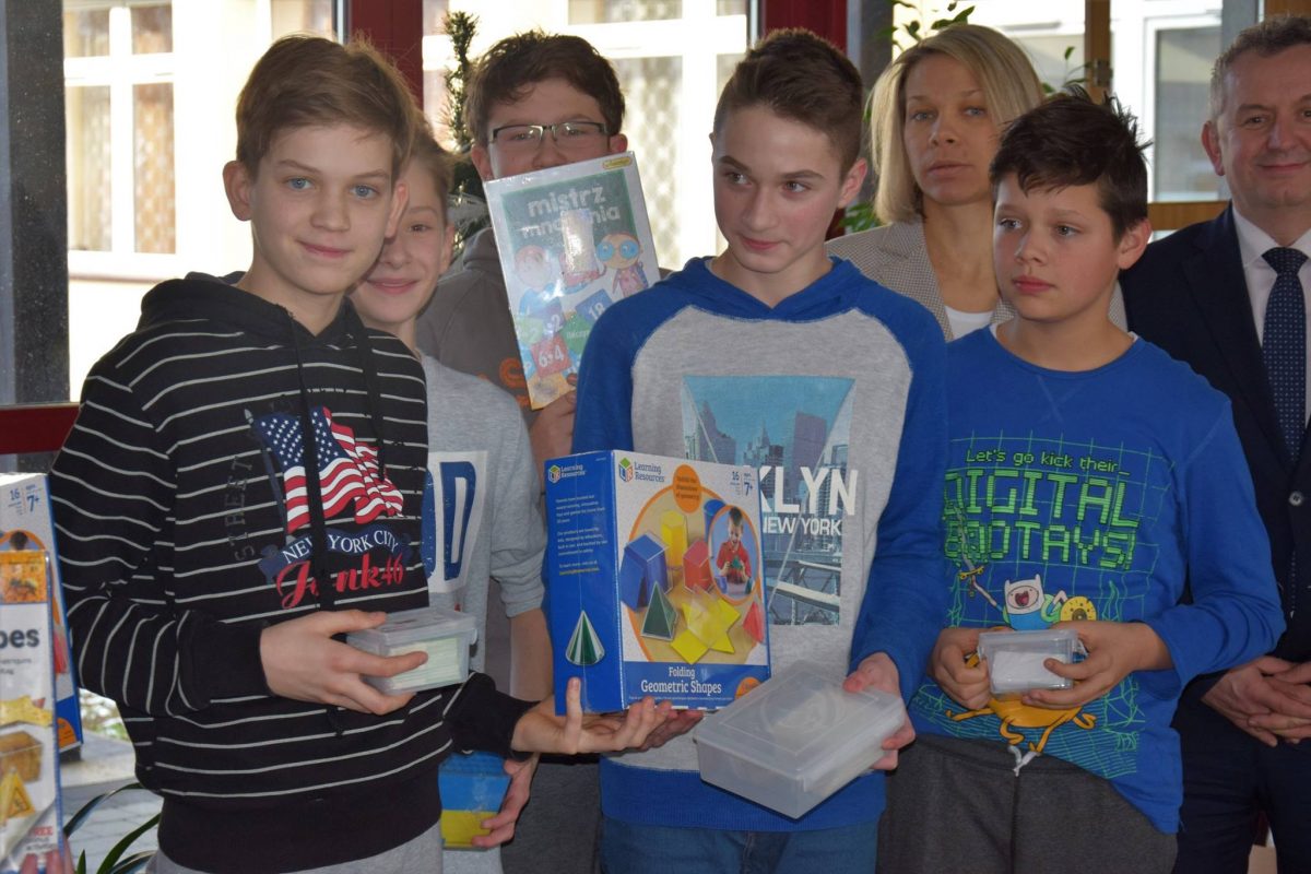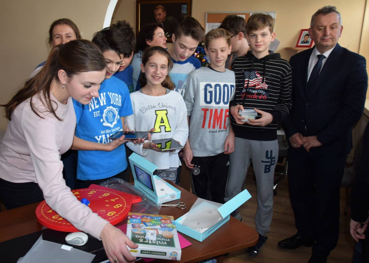 Kazimierz Gizicki zastępca burmistrza Starego Sącza i prezes Stowarzyszenia Lokalna Grupa Działania „Brama Beskidu” Wioletta Derymacka przekazali tablety i pomoce do nauki matematyki uczniom „Jedynki”. To kolejny etap wartego ponad 3,3 mln projektu, obejmującego zakup sprzętu, zajęcia wyrównawcze i rozwijające oraz stypendia dla uczniów.