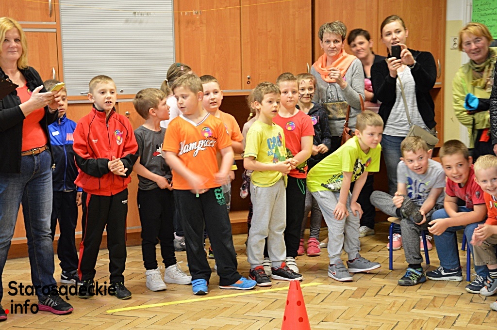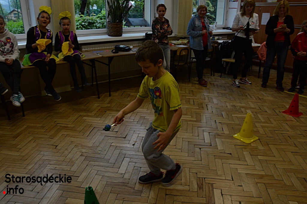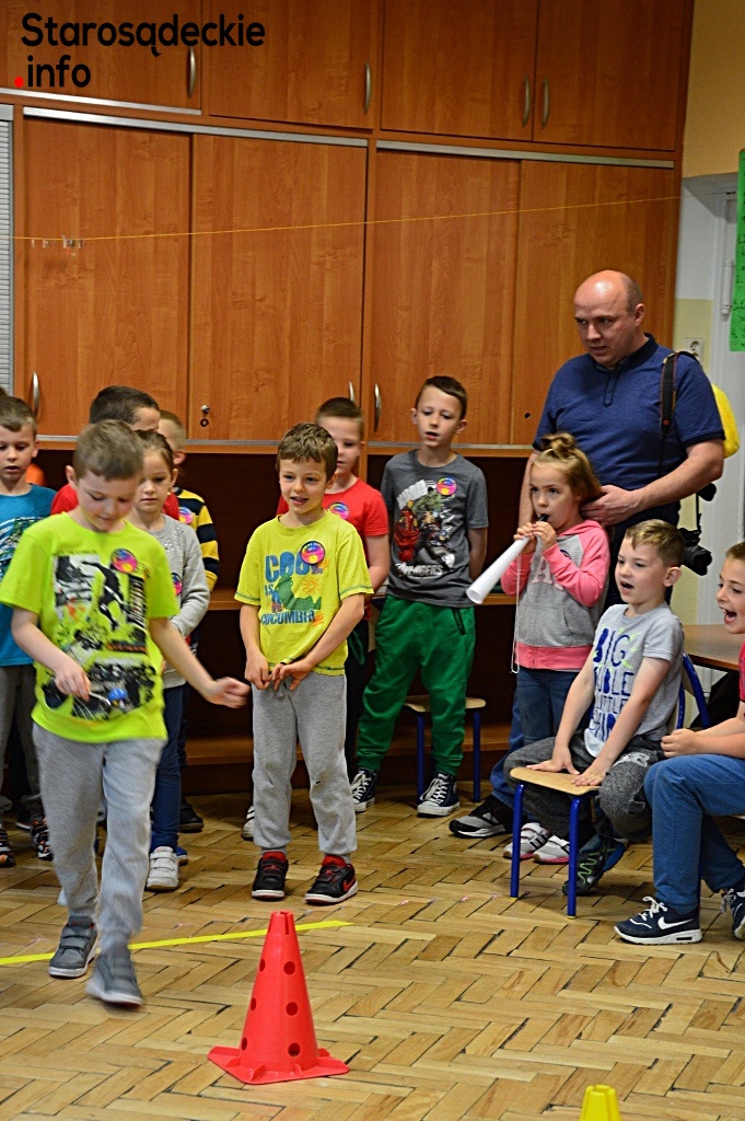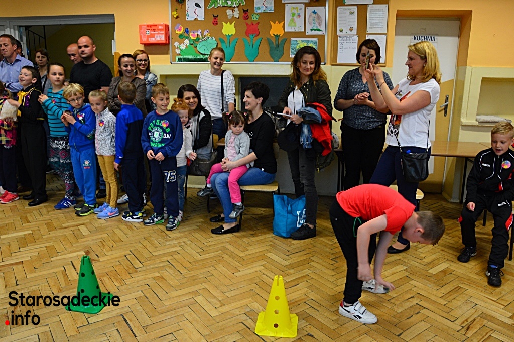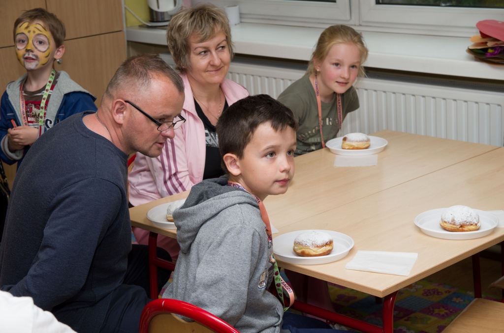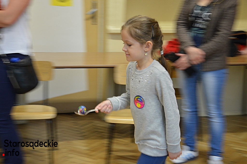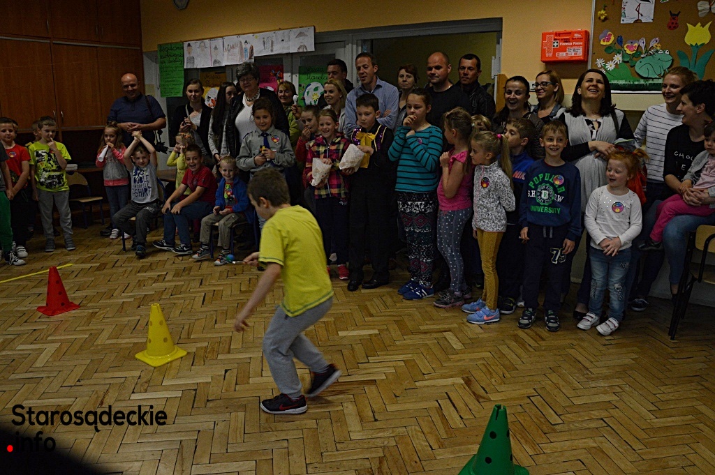 Tymczasem w sali obok trwały w najlepsze zawody sportowe. Miłośnicy aktywności ruchowej w każdym wieku mogli zmierzyć się z nietypowymi konkurencjami: bieg z jajkiem, bieg z piłką, skoki na skakance, obieranie jabłek, zajadanie pączków i wiele wiele innych. Rodzice razem z dziećmi, ramię w ramię i nauczyciele w roli sędziów.