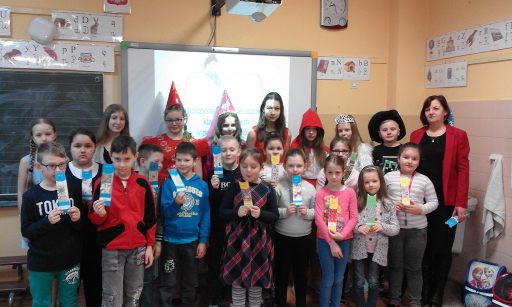 W tym dniu pierwszaki zostali pasowani na czytelników biblioteki szkolnej. Uczniowie należący do szkolnego koła „ Czyta się” przygotowali program artystyczny „Zaczarowany bajek świat”. Nie zabrakło w nim ciekawych zagadek związanych ze znajomością baśni. Dzieci z ogromnym zainteresowaniem obejrzały inscenizację, a aktorów nagrodziły gorącymi brawami. Wśród zaproszonych na uroczystość gości nie zabrakło również Dyrekcji Szkoły Pani Renaty Burchel i Pani Gabrieli Szewczyk.Spotkanie przebiegało w miłej atmosferze.