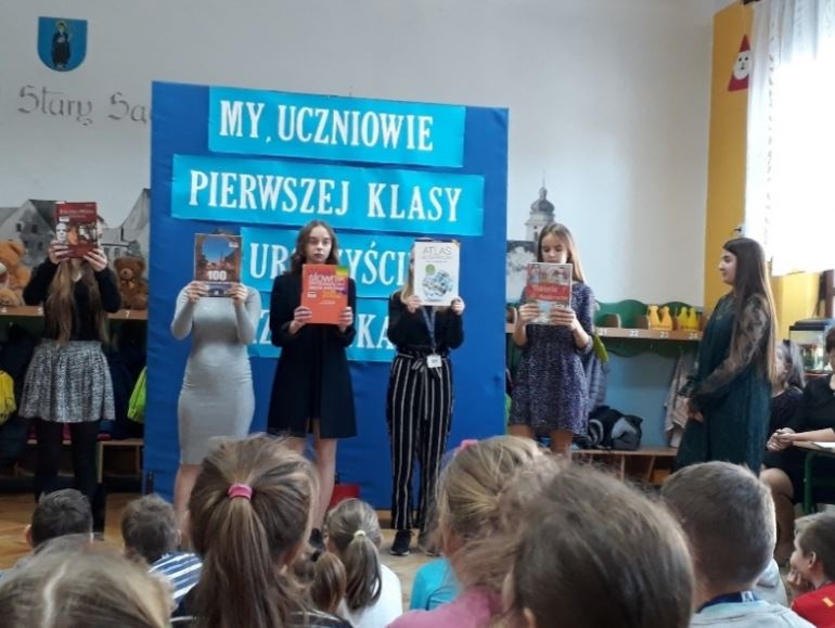 Spotkanie rozpoczęły uczennice klasy 7B. Najpierw Agnieszka Koszyk wyrecytowała wiersz pt. „Książka”. Potem o walorach książki, potrzebie czytania w każdym wieku przekonywała Emilka Rucińska. Następnie pani Halina Madziar zaprosiła do obejrzenia programu przygotowanego przez uczennice klasy 3C gimnazjum. Wielką przyjemnością było patrzeć na zadziwione i uśmiechnięte buzie pierwszaków, gdy na scenie pojawiły się: stara, zniszczona książka – Aleksandra Tyka (ucz. kl. 4A), Atlas, Encyklopedia, Album, Słownik, Baśnie (Joanna Wójcik, Weronika Dolińska, Aleksandra Szczęsna, Sylwia Wojtas, Marta Pustułka) i czytelnik, wybierający jedną z nich – Laura Korona. Dzieci zaprezentowały swoje umiejętności czytelnicze, samodzielnie odczytując z dużych, kolorowych plakatów prośby zniszczonej książki. Jednak największą atrakcją wzbudzającą ogólną wesołość było przedstawienie „Moda na czytanie”. „Rywale książki”: komputer, Internet, mysz komputerowa, drukarka, telefon komórkowy zachwalający swoje walory przegrali na korzyść książki, bo: