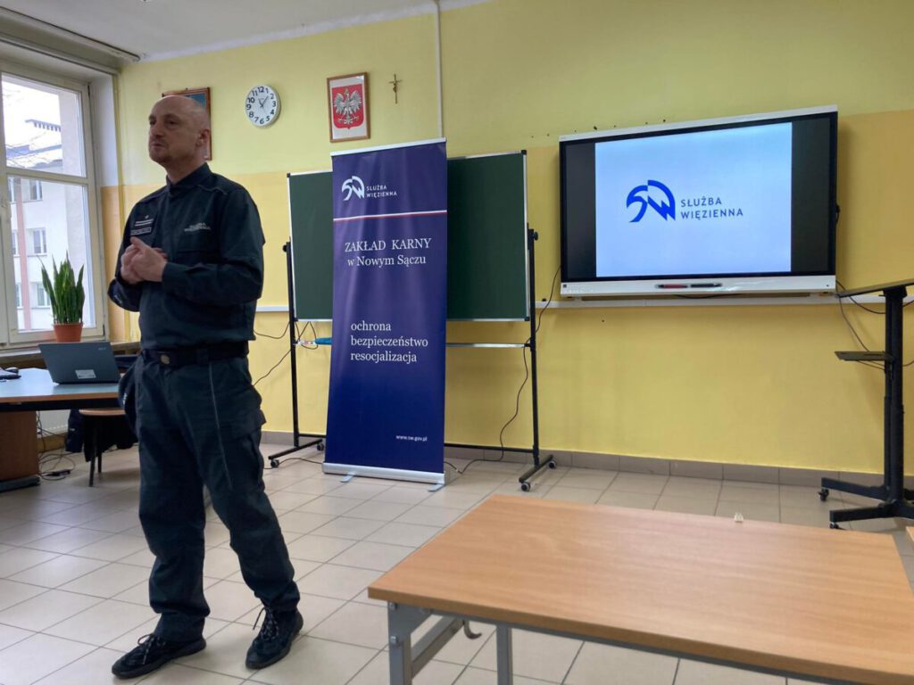 Dodatkowo uczniów w szkole odwiedził mjr Dariusz Janik, rzecznik prasowy Zakładu Karnego w Nowym Sączu, który opowiedział jak funkcjonuje zakład i z jakimi osadzonymi na co dzień mają do czynienia, jak również dowiedzieć się więcej na temat realiów pracy w Służbie Więziennej. Tę wizytę z pewnością zapamiętają na długo.