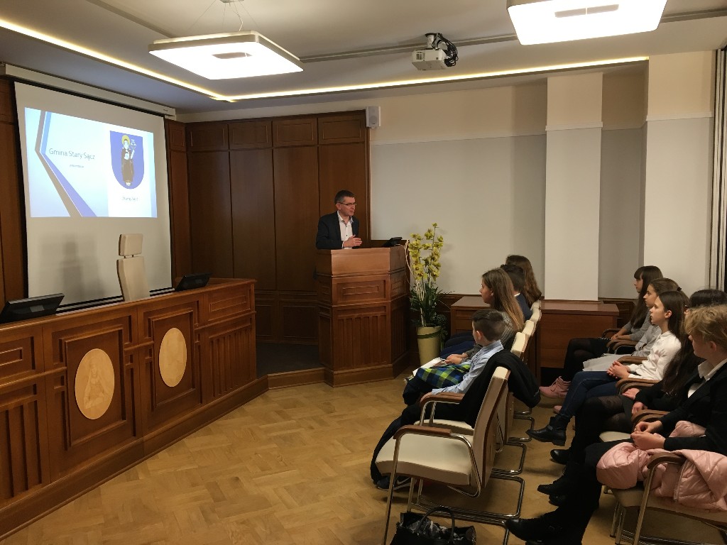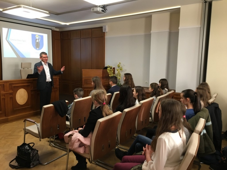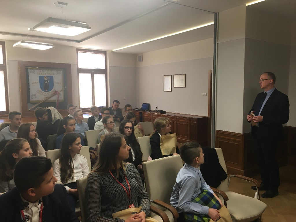Podczas wizyty Burmistrz przedstawił uczniom najważniejsze informacje dotyczące Gminy Stary Sącz. Dzieci miały możliwość wykazać się wiedzą na temat funkcjonowania Urzędu oraz zadań jakie wykonują jego pracownicy. Następnie przyszła kolei na pytania uczniów zarówno do Burmistrza jak również do Sekretarza pana Daniela Śmierciaka, który koordynował spotkanie. Najbardziej aktywni uczniowie zostali nagrodzeni przez organizatorów.