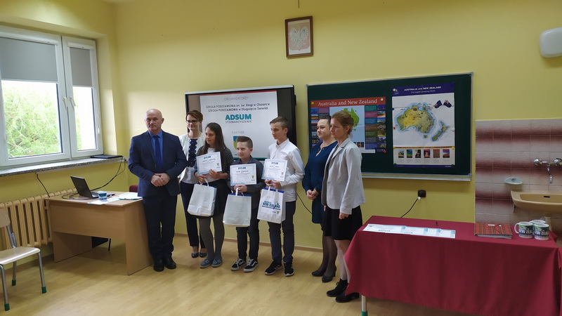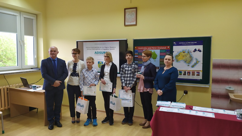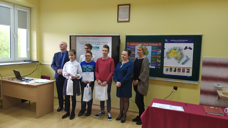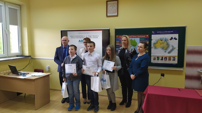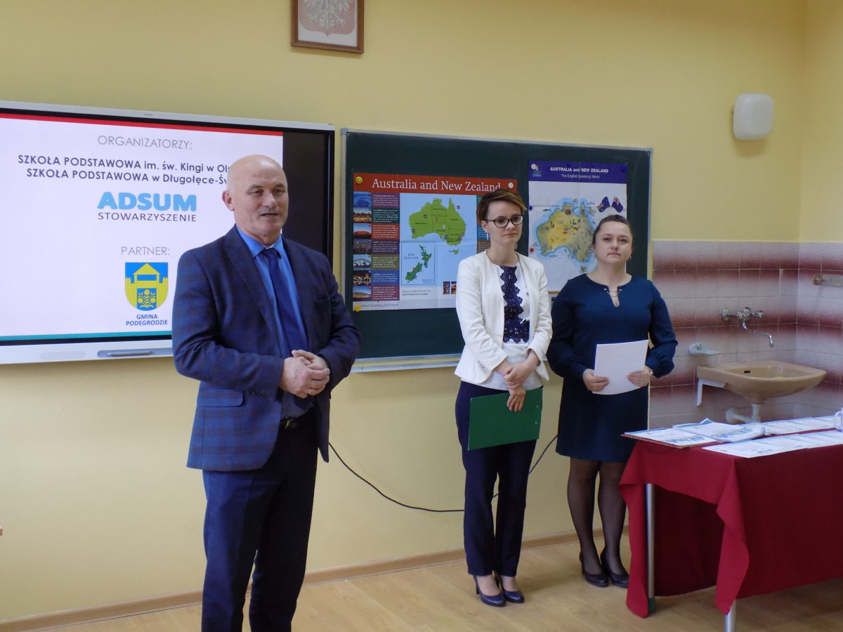 Na zakończenie wręczono podziękowania za wsparcie i pomoc w organizacji konkursu dla: Pana Stanisława Mazura Zastępcy Wójta Gminy Podegrodzie, Pani Magdaleny Konstanty Prezes Banku Spółdzielczego w Podegrodziu, Pani Katarzyny Platy Dyrektora Szkoły Podstawowej w Długołęce-Świerkli, Pani Wioletty Oleksy Dyrektora Szkoły Podstawowej im. św. Kingi w Olszance oraz Pani Urszuli Potoniec-Mędoń Prezes Stowarzyszenia ADSUM, Pani Julie Bordeaux, native speakera z Zespołu Szkół Społecznych „Splot” w Nowym Sączu.