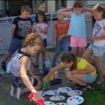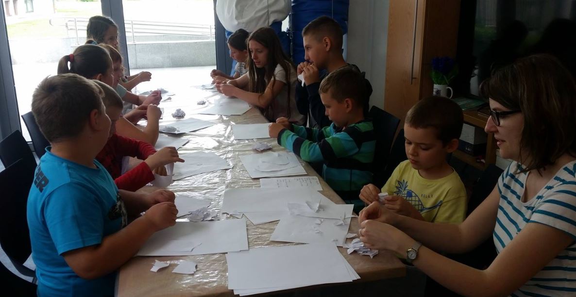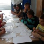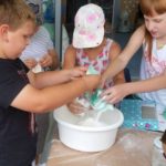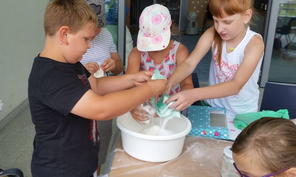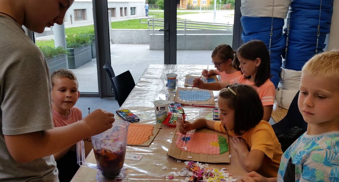 Nie zabrakło też zajęć twórczych. Dzieci wzięły udział w plenerze malarskim, w warsztatach papieru czerpanego, przygotowywały letnie lampiony do ogrodu w technice decupage oraz zakładki zachęcające do czytania. Uczestnicy przygotowywali stworki z masy solnej, a następnie dekorowali je w fantazyjny sposób. Powstały wielobarwne mozaiki z ziaren, a także okładki do książek pt. „Moje wakacyjne przygody”. Dla niektórych nowością było malowanie kamieni oraz malowanie kawą. Te niecodzienne techniki przykuły uwagę dzieci. Ciekawostką było również tworzenie gigantycznych baniek mydlanych.